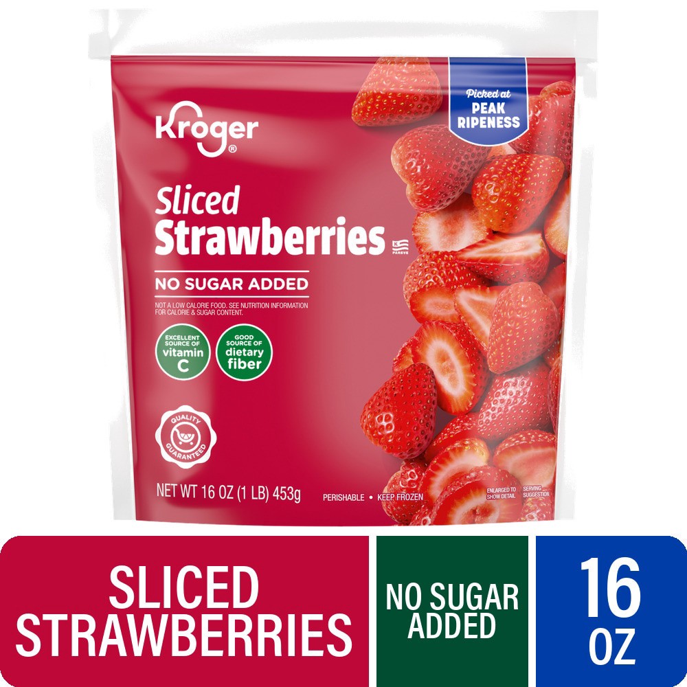 Kroger® Frozen Sliced Strawberries shine with same nutritional value as fresh fruit! Each bag is filled with ripe strawberries, picked at peak ripeness. With no sugar addedˆ, you can enjoy bursting be…