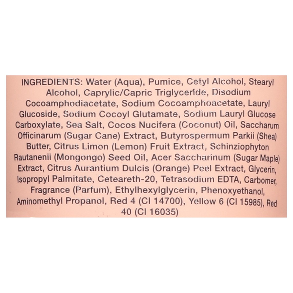 Water (Aqua), Pumice, Cetyl Alcohol, Stearyl Alcohol, Caprylic/Capric Triglyceride, Disodium Cocoamphodiacetate, Sodium Cocoamphoacetate, Lauryl Glucoside, Sodium Cocoyl Glutamate, Sodium Lauryl Gluco…