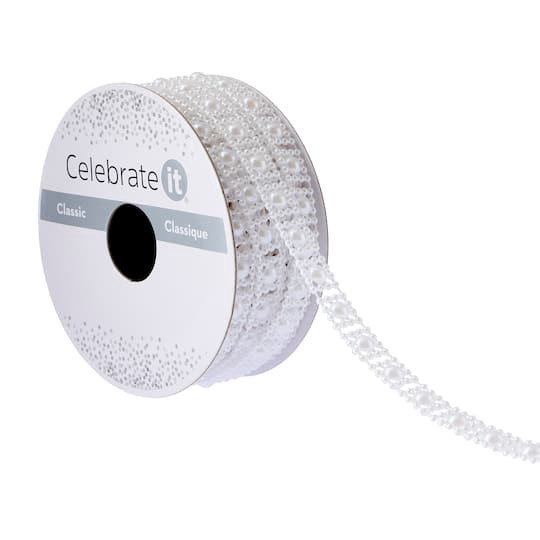 Shop for this 3/8" x 3yd. White Pearl Ribbon by Celebrate It Classic at Michaels. Add elegance to your craft projects with this beaded ribbon. The perfect embellishment for wreaths, costumes and decor…