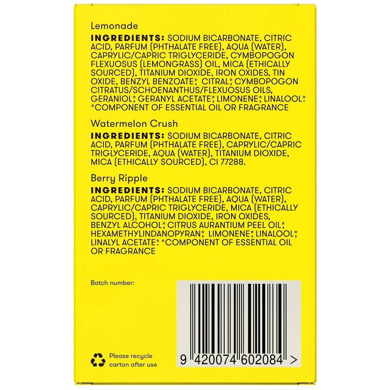 Berry Ripple - SODIUM BICARBONATE, CITRIC ACID, PARFUM (PHTHALATE FREE), AQUA [WATER), CAPRYLIC/CAPRIC TRIGLYCERIDE, MICA (ETHICALLY SOURCED), TITANIUM DIOXIDE, IRON OXIDES, BENZYL ALCOHOL* CITRUS AUR…