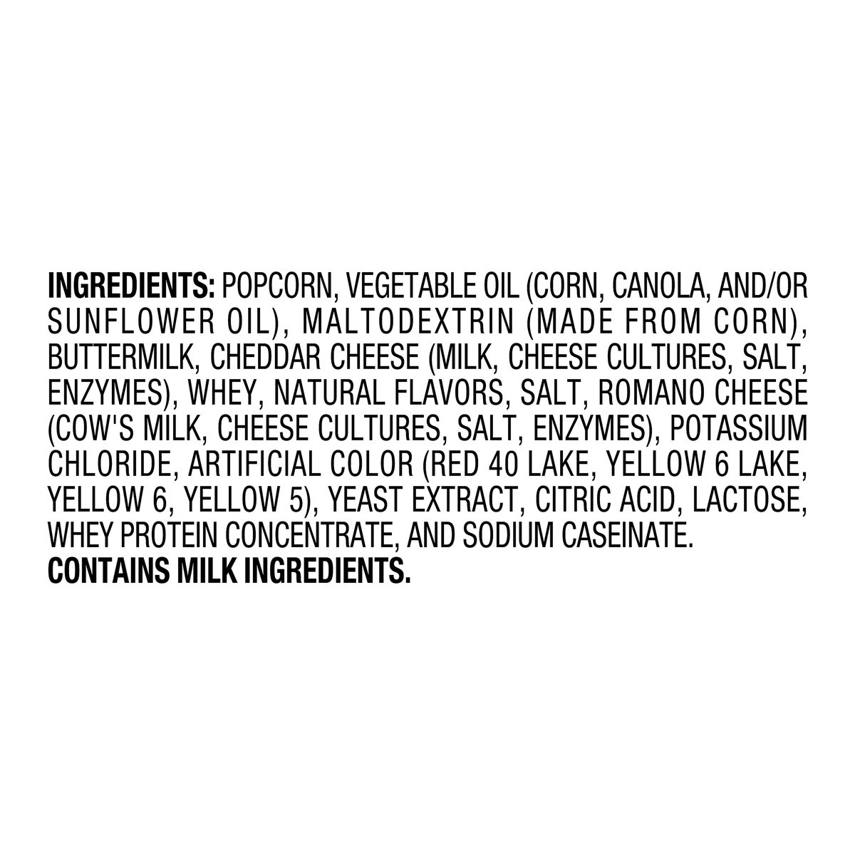 Popcorn, Vegetable Oil (Corn, Canola, and/or Sunflower Oil), Maltodextrin (Made from Corn), Buttermilk, Cheddar Cheese (Milk, Cheese Cultures, Salt, Enzymes), Whey, Natural Flavors, Salt, Romano Chees…