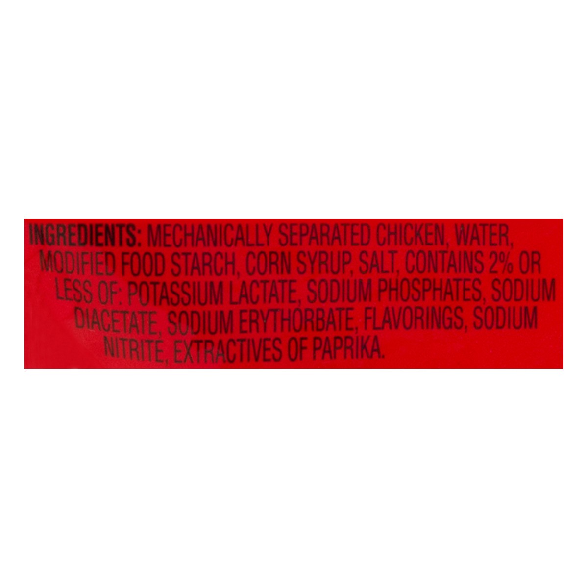 Mechanically Separated Chicken, Water, Modified Food Starch, Corn Syrup, Salt, Contains 2% or Less of: Potassium Lactate, Sodium Phosphates, Sodium Diacetate, Sodium Erythorbate, Flavorings, Sodium Ni…