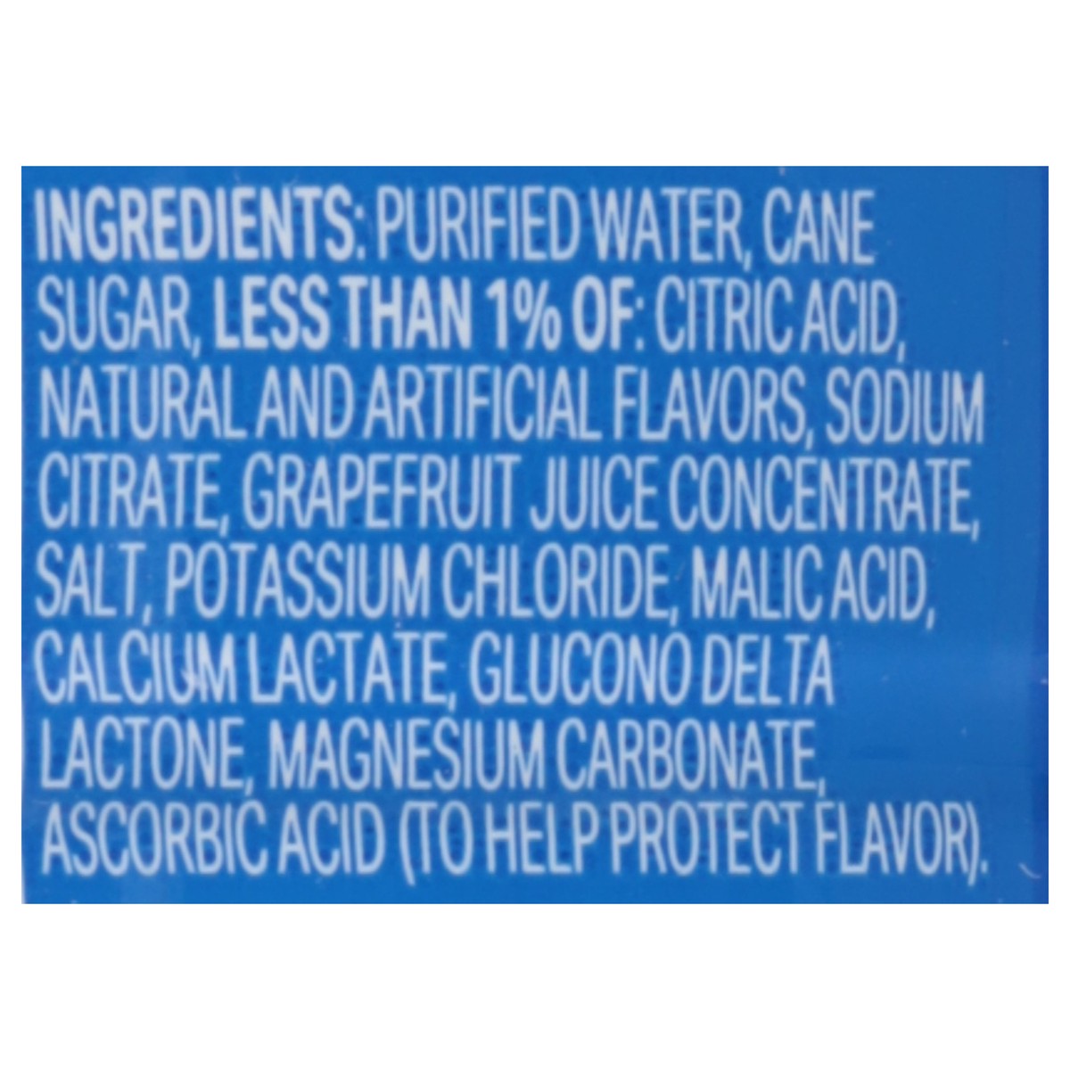 Purified Water, Cane Sugar, Less than 1% of: Citric Acid, Natural and Artificial Flavors, Sodium Citrate, Grapefruit Juice Concentrate, Salt, Potassium Chloride, Malic Acid, Calcium Lactate, Glucono D…