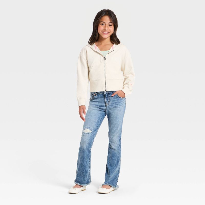 Girls' French Terry Hearts Hoodie Zip-Up Sweatshirt - Cat & Jack™ Light Beige L