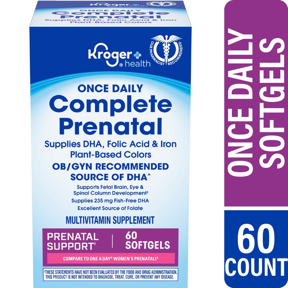 Kroger® Once Daily Complete Prenatal Softgels cater to women's nutritional requisites before, during, and after pregnancy. Containing vitamins A through E, as well as vitamin K and several minerals, t…