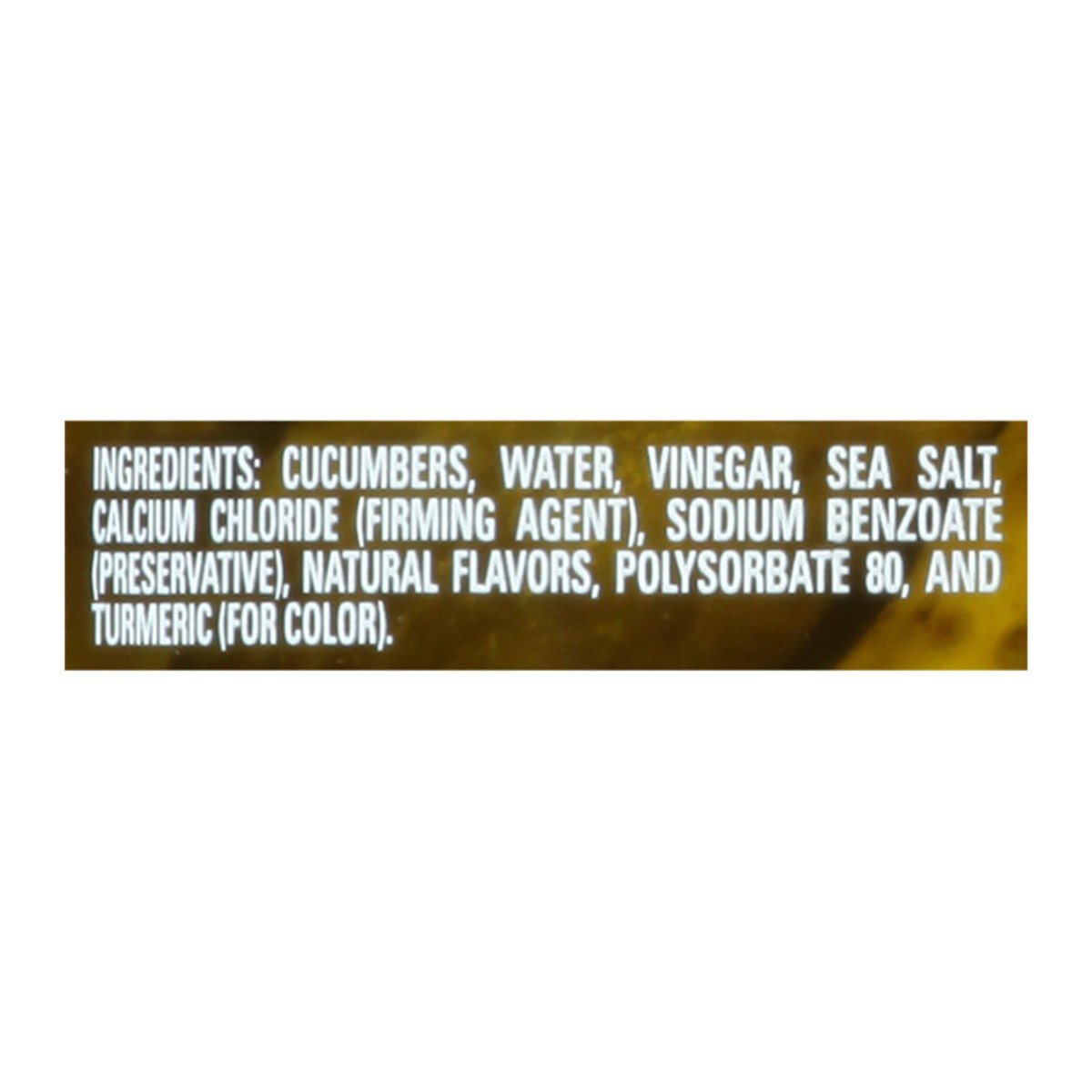 Cucumbers, Water, Vinegar, Sea Salt, Calcium Chloride (Firming Agent), Sodium Benzoate (Preservative), Natural Flavors, Polysorbate 80, and Turmeric (for Color).