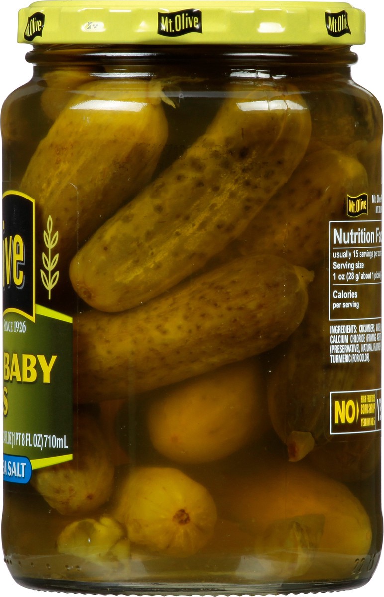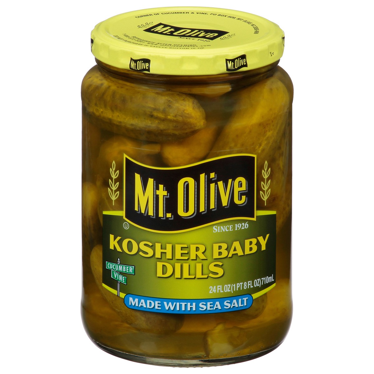Crunchy and delicious, Mt. Olive Kosher Baby Dills with Sea Salt are the perfect accompaniment to sandwiches, burgers, hot dogs and more! Enjoy these flavorful pickles out of the jar as a snack or cho…