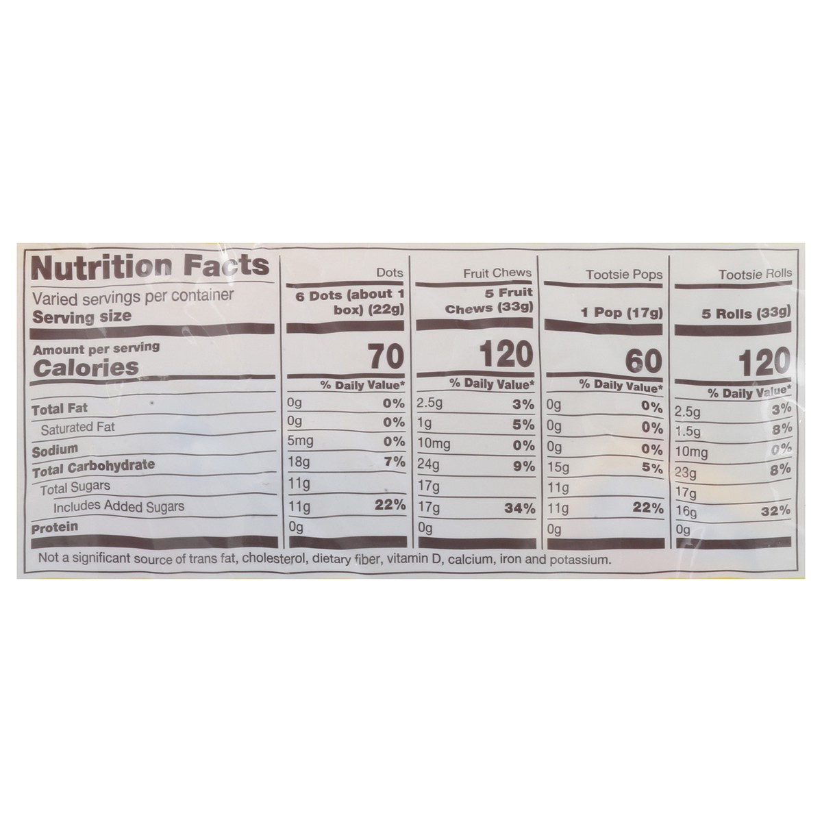 Dots: Corn Syrup, Sugar, Food Starch Modified, Malic Acid, Natural and Artificial Flavors, Sodium Citrate, Artificial Colors (Including FD&C Red 40, Yellow 5, Blue 1). Fruit Chews: Sugar, Corn Syrup, …
