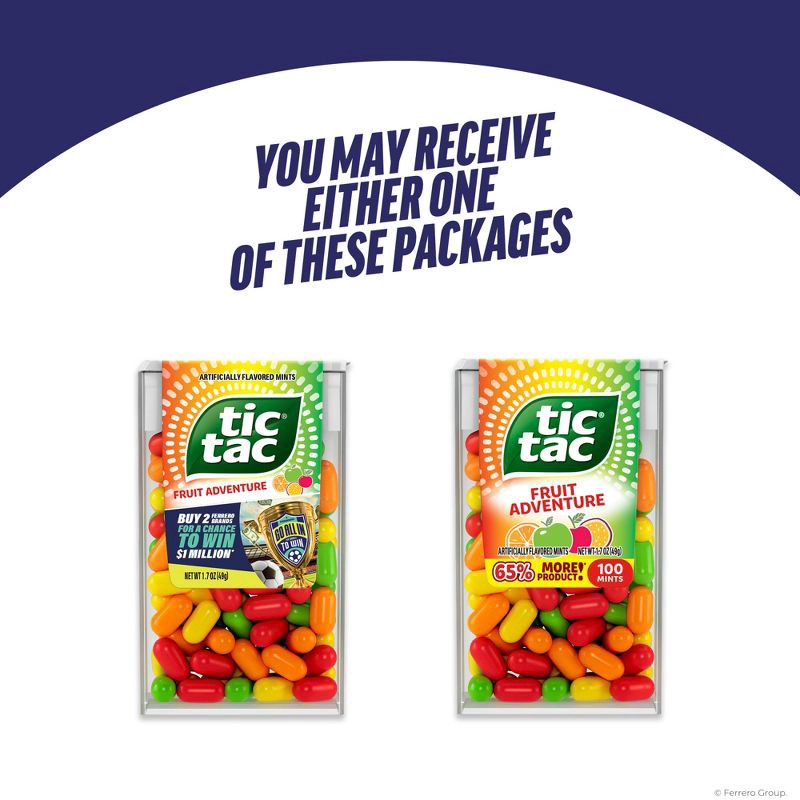 - REFRESHING MINTS: Each mint in this 1.7 oz pack of Tic Tac Fruit Adventure has 100 layers of refreshing and delicious flavor