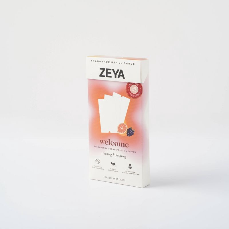 - ZEYA Welcome Scent Card Refill Value Pack Includes: 3 pre-loaded fragrance refill cards in the Welcome Scent (diffuser sold separately)