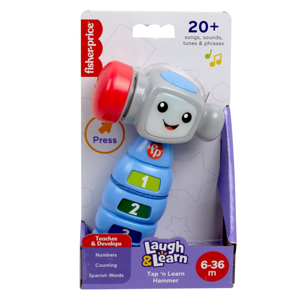 Baby's got a real tool friend…the Tap ‘n Learn Hammer! Just press the smiling character face or tap the hammer to activate music, lights and sounds. Baby will learn numbers, counting, Spanish and more…
