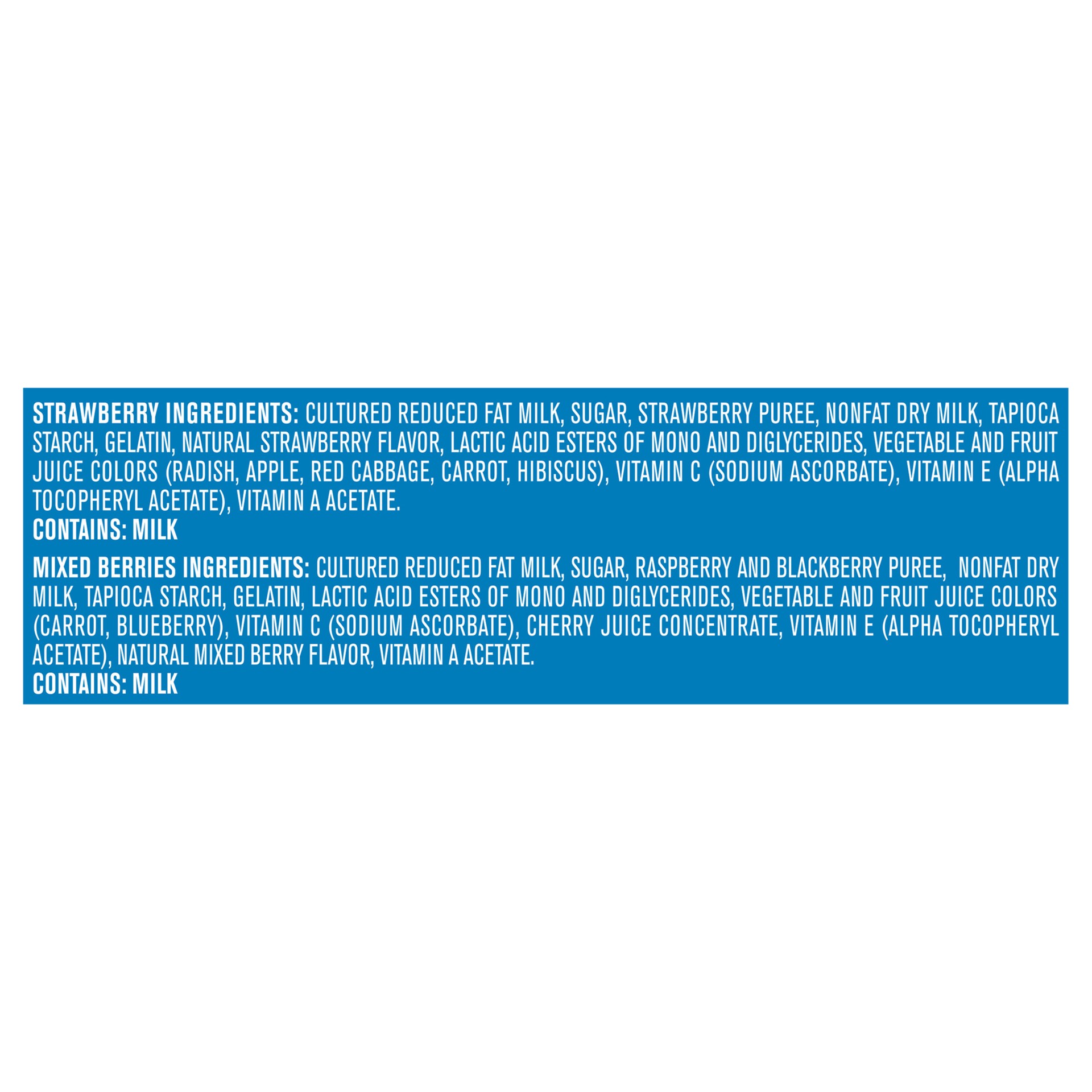 Strawberry: Strawberry Ingredients: Cultured Reduced Fat Milk, Sugar, Strawberry Puree, Nonfat Dry Milk, Tapioca Starch, Gelatin, Natural Strawberry Flavor, Lactic Acid Esters of Mono and Diglycerides…