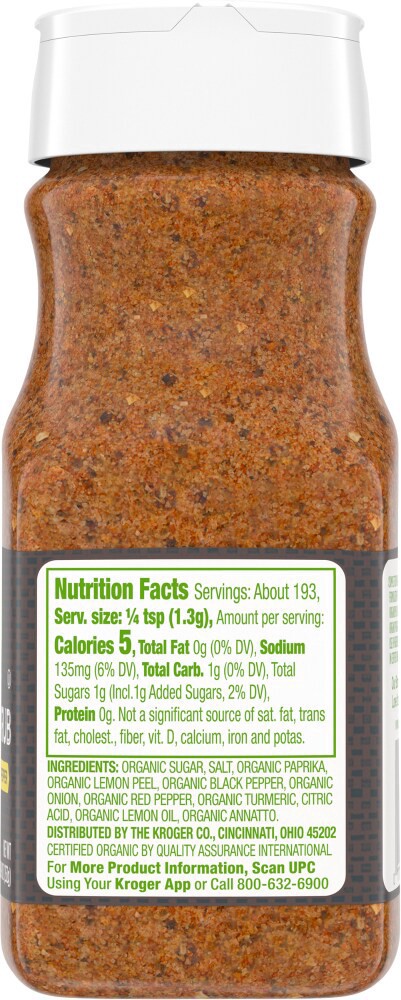 Organic Sugar, Salt, Organic Paprika, Organic Lemon Peel, Organic Black Pepper, Organic Onion, Organic Red Pepper, Organic Turmeric, Citric Acid, Organic Lemon Oil, Organic Annatto.