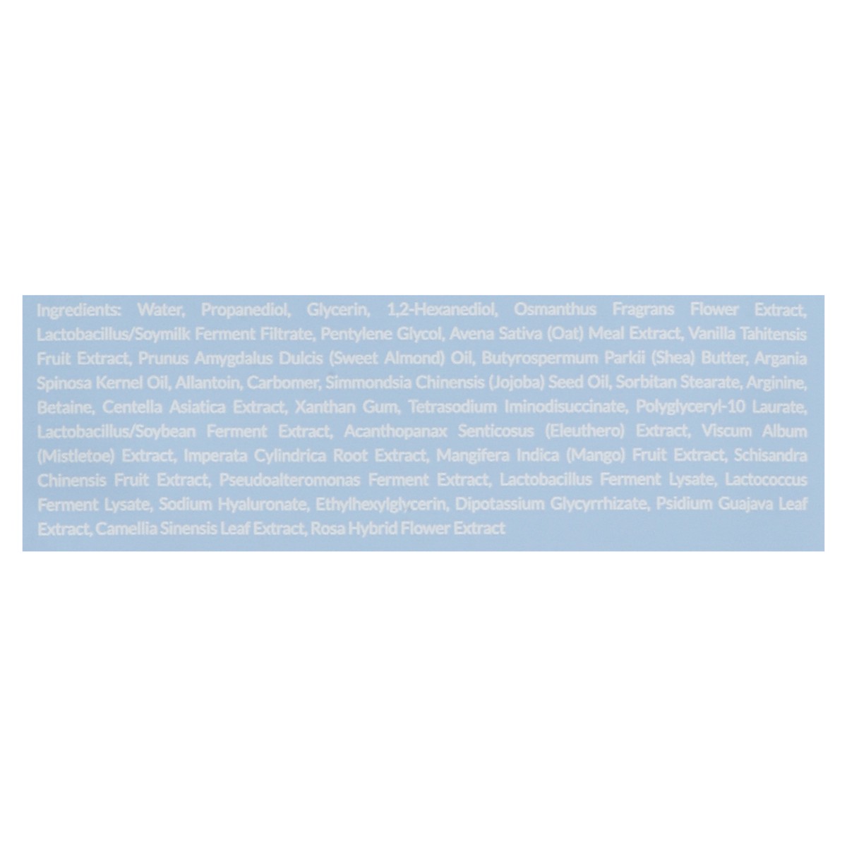 Water, Propanediol, Glycerin, 1.2-Hexanediol, Osmanthus Fragrans Flower Extract, Lactobacillus/Soymilk Ferment Filtrate, Pentylene Glycol, Avena Sativa (Oat) Meal Extract, Vanilla Tahitensis Fruit Ext…