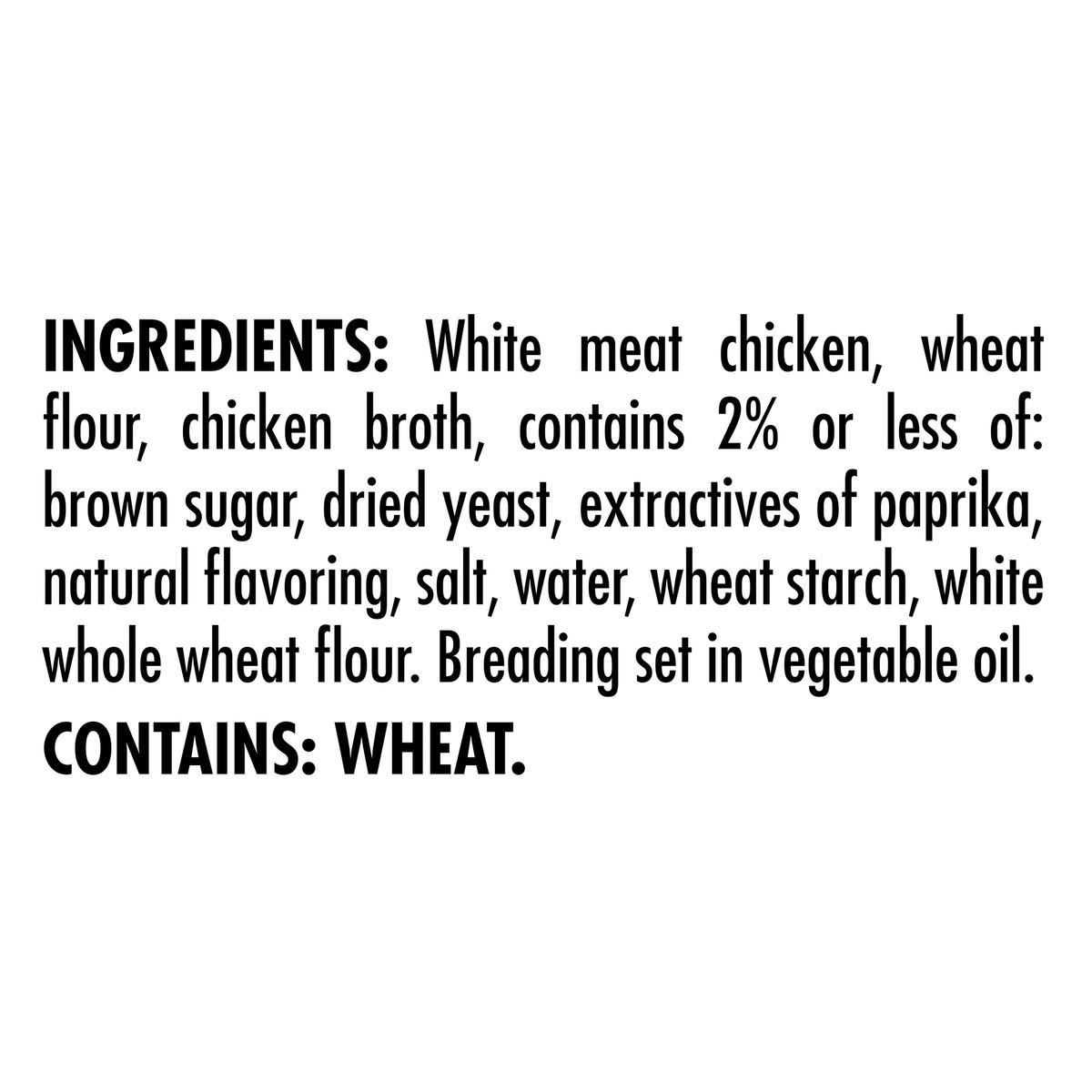 White Meat Chicken, Wheat Flour, Chicken Broth, Contains 2% or Less of: Brown Sugar, Dried Yeast, Extractives of Paprika, Natural Flavoring, Salt, Water, Wheat Starch, White Whole Wheat Flour, Breadin…