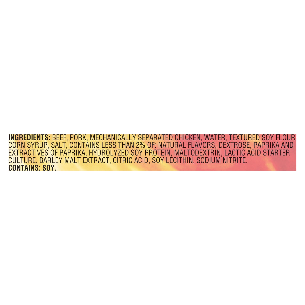Beef, Pork, Mechanically Separated Chicken, Water, Textured Soy Flour, Corn Syrup, Salt, Contains Less than 2% of: Natural Flavors, Dextrose, Paprika and Extractives of Paprika, Hydrolyzed Soy Protein…