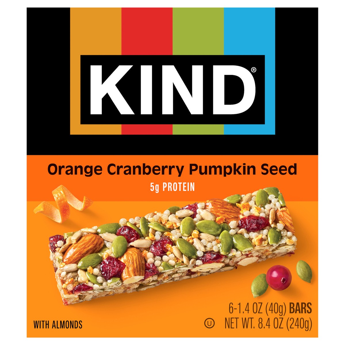 - Six 1.4-oz KIND Seeds Fruit & Nuts Orange Cranberry Pumpkin Seed gluten free bars