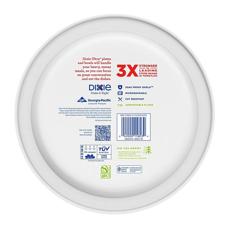 - Responsibly Made: Dixie Ultra® large paper plates (10 1/16"") deliver the same strength and performance, but with the added benefit of being compostable except in California.