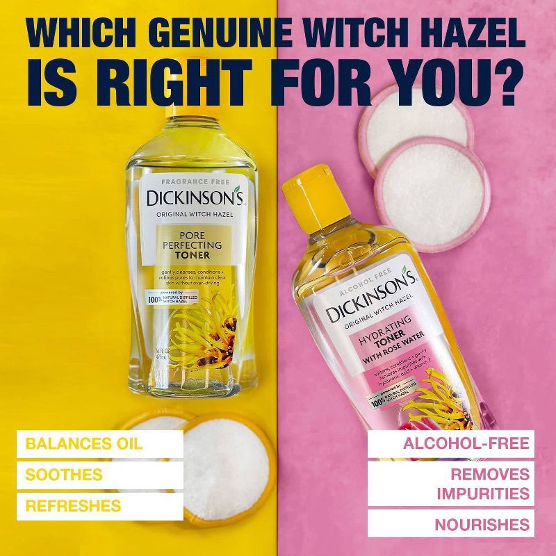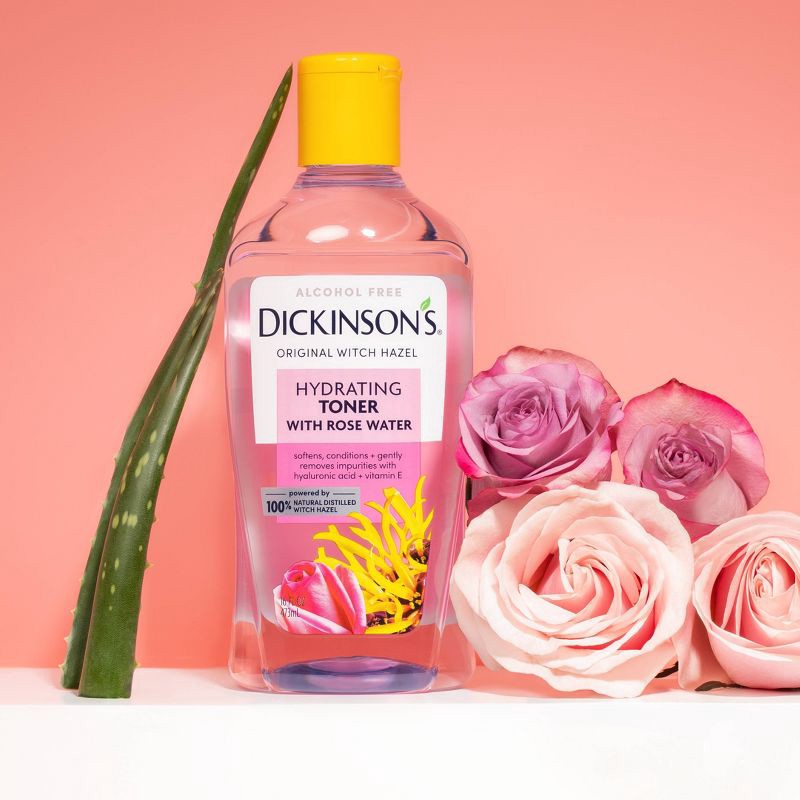 Dickinson's Witch Hazel Hydrating Toner with Rosewater gently nourishes and tones skin with Hyaluronic Acid, Aloe, and Vitamin E. This alcohol-free formula removes impurities while leaving your comple…