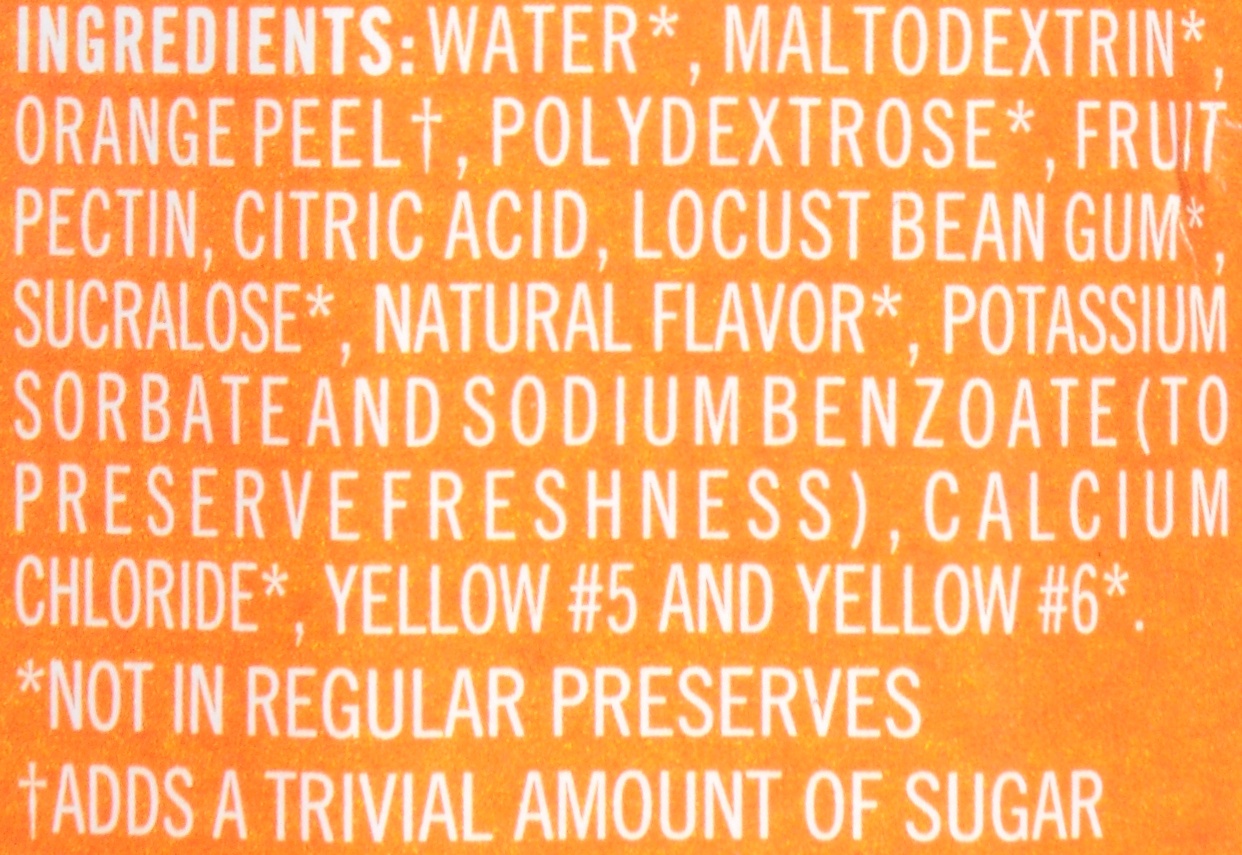 Water\, Maltodextrin (Not in Regular Preserves)\, Orange Peel (Adds a Trivial Amount of Sugar)\, Polydextrose (Not in Regular Preserves)\, Fruit Pectin\, Locust Bean Gum (Not in Regular Preserves)\, C…