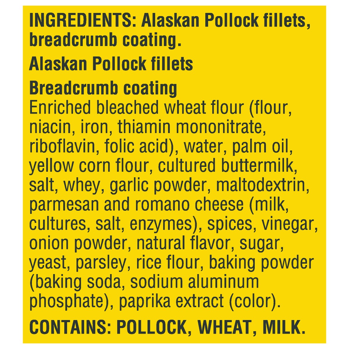 Alaska Pollock fillet, Breadcrumb coating: Enriched bleached wheat flour (flour, niacin, iron, thiamin, mononitrate, riboflavin, folic acid), water, palm oil, yellow corn flour, cultured buttermilk, s…