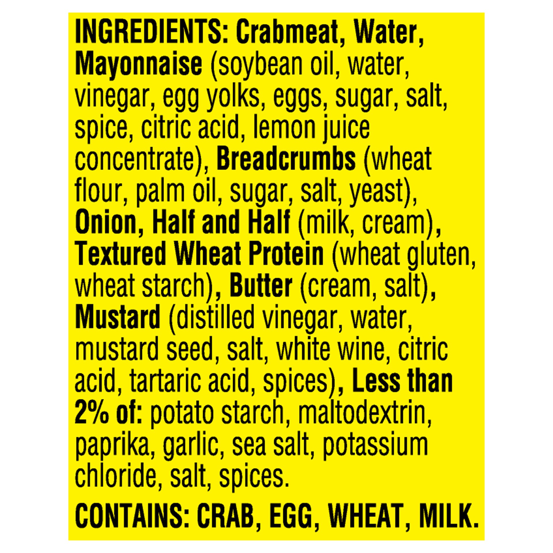 CRABMEAT, WATER, MAYONNAISE [SOYBEAN OIL, EGG YOLKS, WATER, DISTILLED VINEGAR, SALT, CIDER VINEGAR, EGG WHITE SOLIDS, PAPRIKA EXTRACT (COLOR), NATURAL FLAVOR], BREADCRUMBS (WHEAT FLOUR, EVAPORATED CAN…