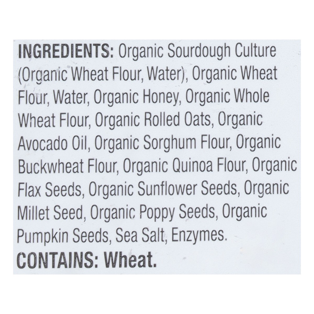 Organic Sourdough Culture (Organic Wheat Flour, Water), Organic Wheat Flour, Water, Organic Honey, Organic Whole Wheat Flour, Organic Rolled Oats, Organic Avocado Oil, Organic Sorghum Flour, Organic B…