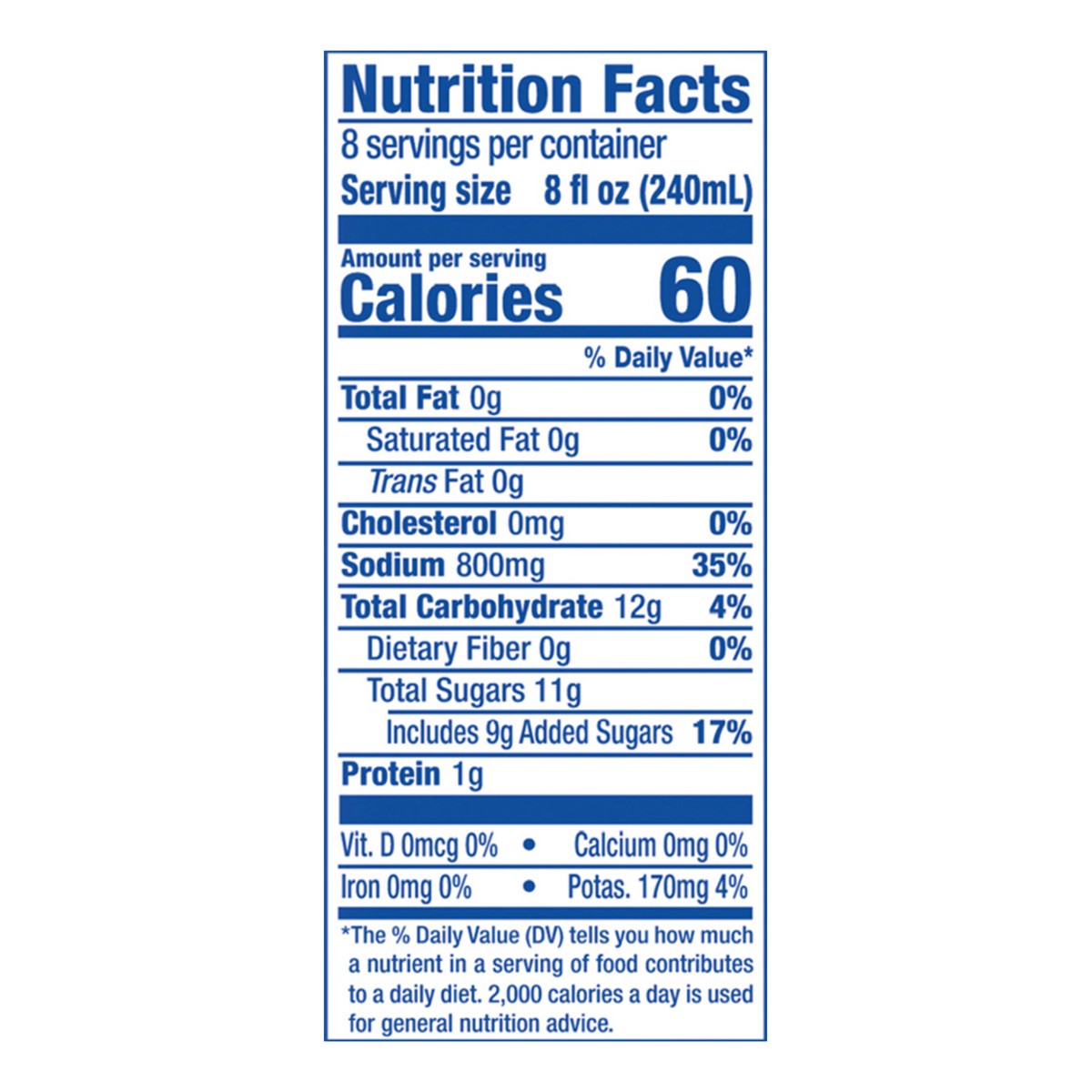Water, Tomato Concentrate, High Fructose Corn Syrup, Monosodium Glutamate, Salt, Citric Acid, Spices, Onion and Garlic Powder, Ascorbic Acid (to Maintain Color), Dried Clam Broth, Vinegar, Natural Fla…