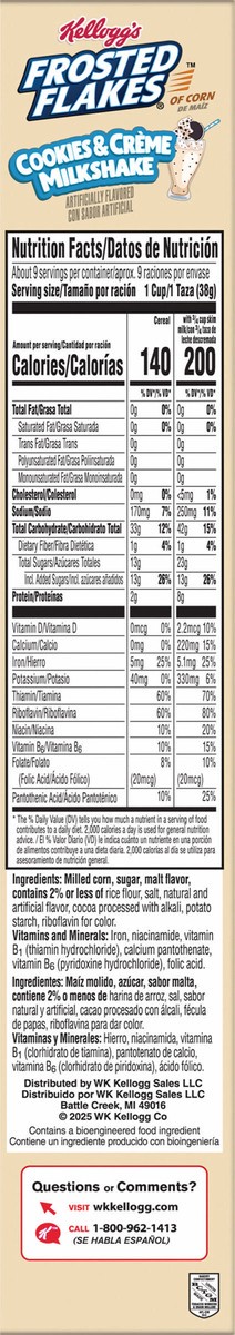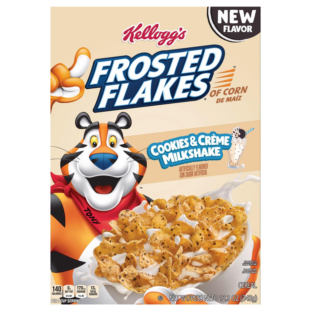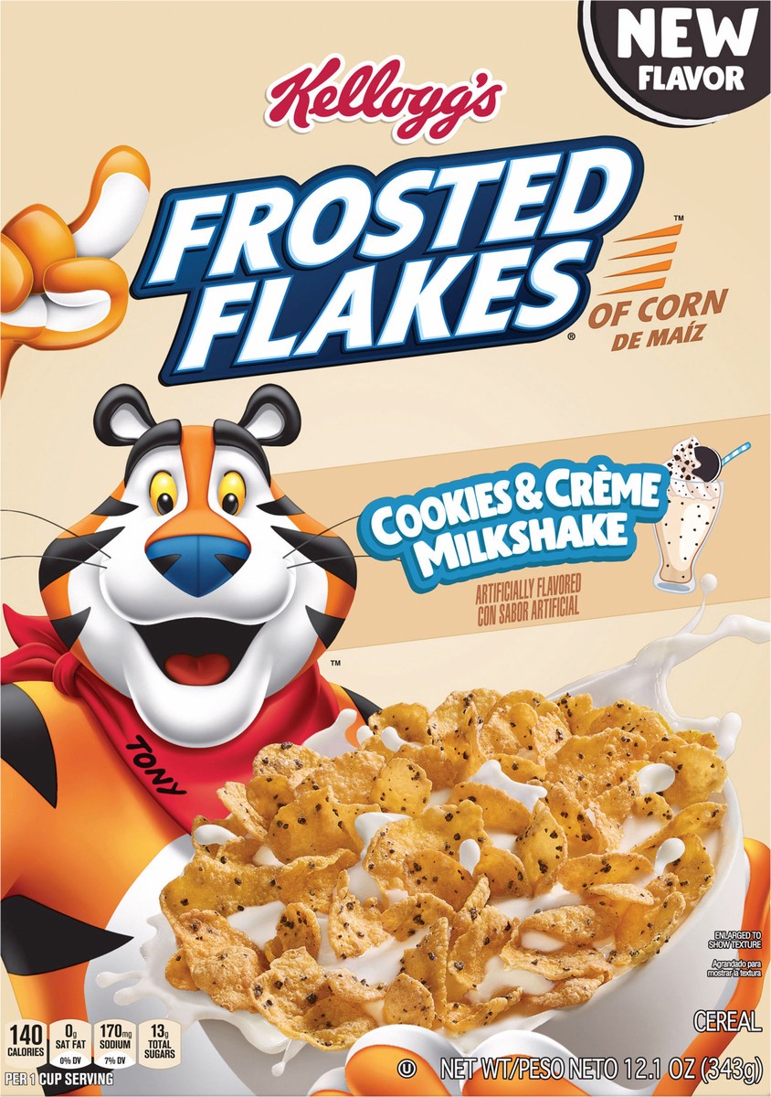 - Enjoy the taste of Kellogg's Frosted Flakes Cookies and Creme Milkshake cereal; Slurp up crunchy
