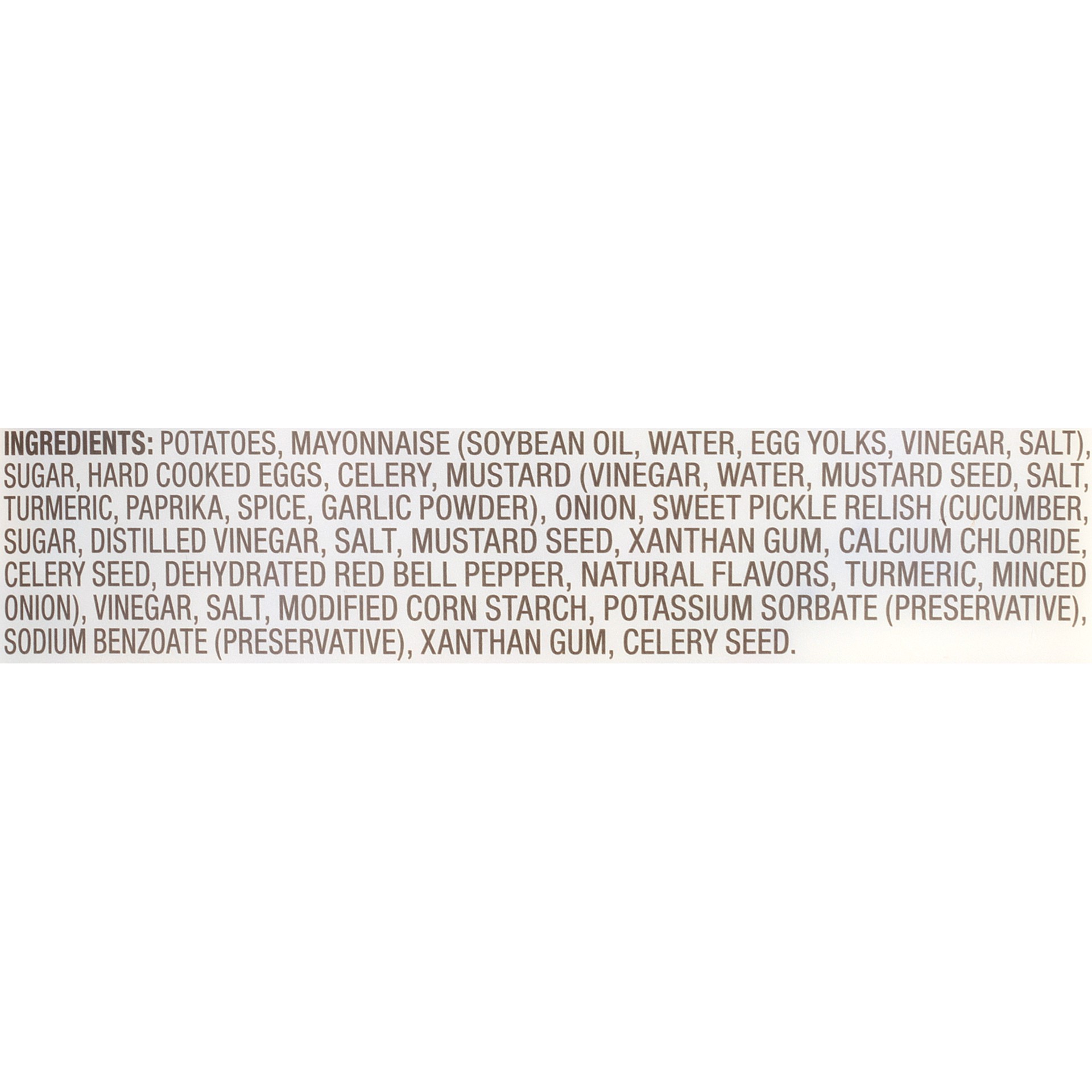 Potatoes, Mayonnaise (Soybean Oil, Water, Egg Yolks, Vinegar, Salt), Sugar, Hard Cooked Eggs, Celery, Mustard (Vinegar, Water, Mustard Seed, Salt, Turmeric, Paprika, Spice, Garlic Powder), Onion, Swee…