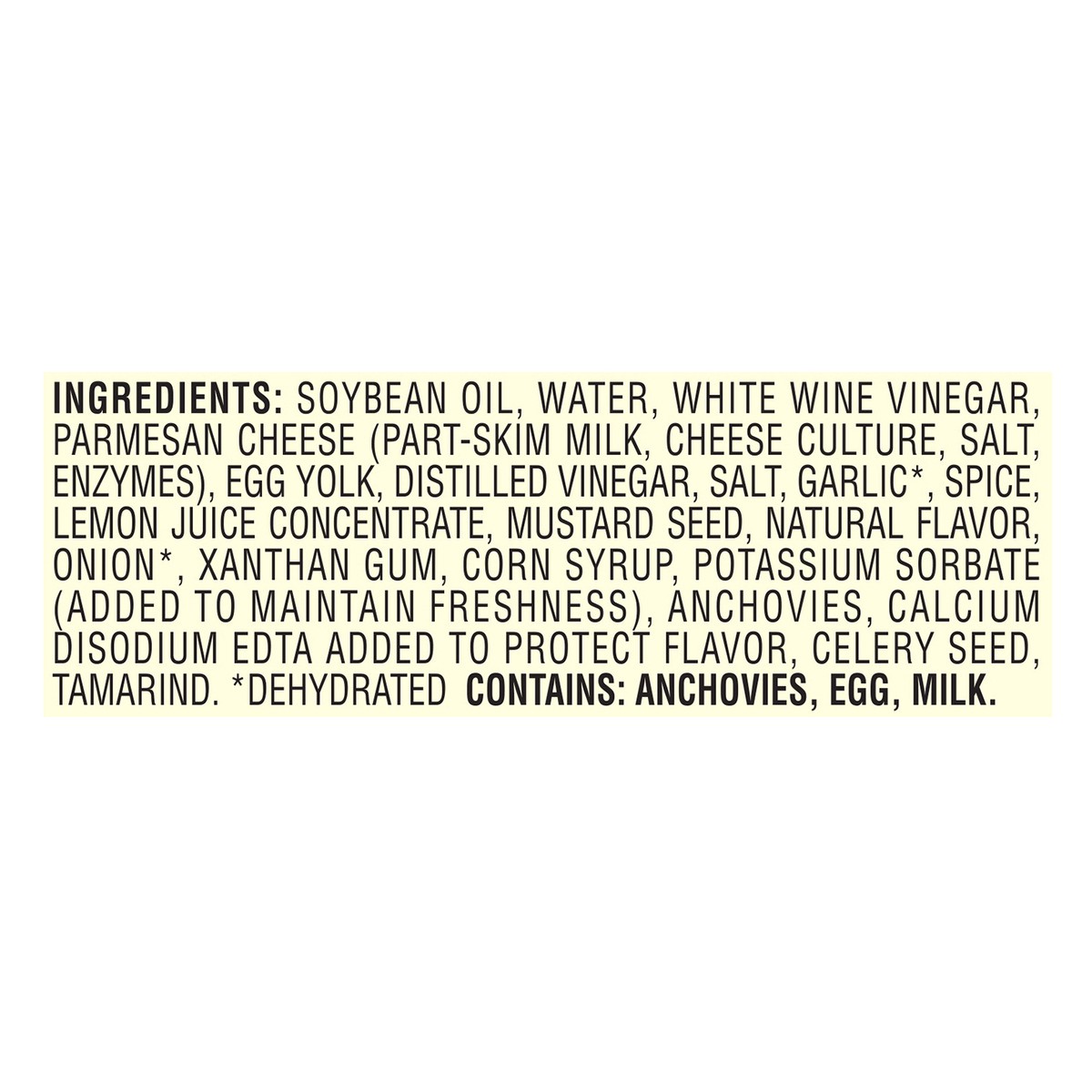 Soybean Oil, Water, White Wine and Distilled Vinegars, Parmesan Cheese (Part-Skim Milk, Cheese Culture, Salt, Enzymes), Egg Yolk, Salt, Garlic (Dehydrated), Spice, Lemon Juice Concentrate, Mustard See…