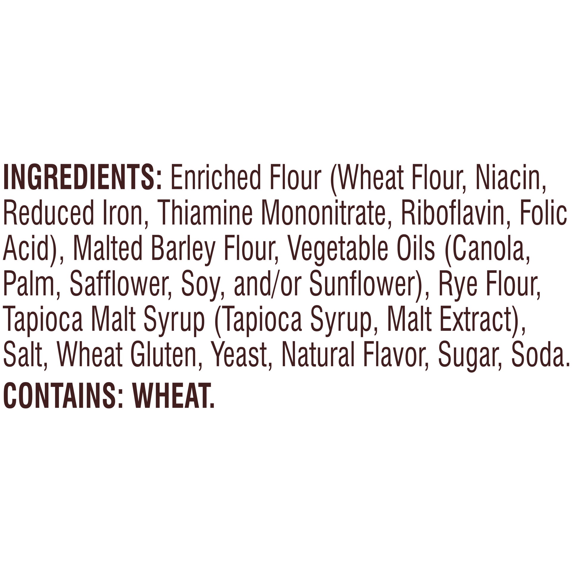 INGREDIENTS: ENRICHED FLOUR (WHEAT FLOUR, NIACIN, REDUCED IRON, THIAMINE MONONITRATE, RIBOFLAVIN, FOLIC ACID), MALTED BARLEY FLOUR, VEGETABLE OILS (CANOLA, SAFFLOWER, SOY, AND/OR SUNFLOWER), RYE FLOUR…