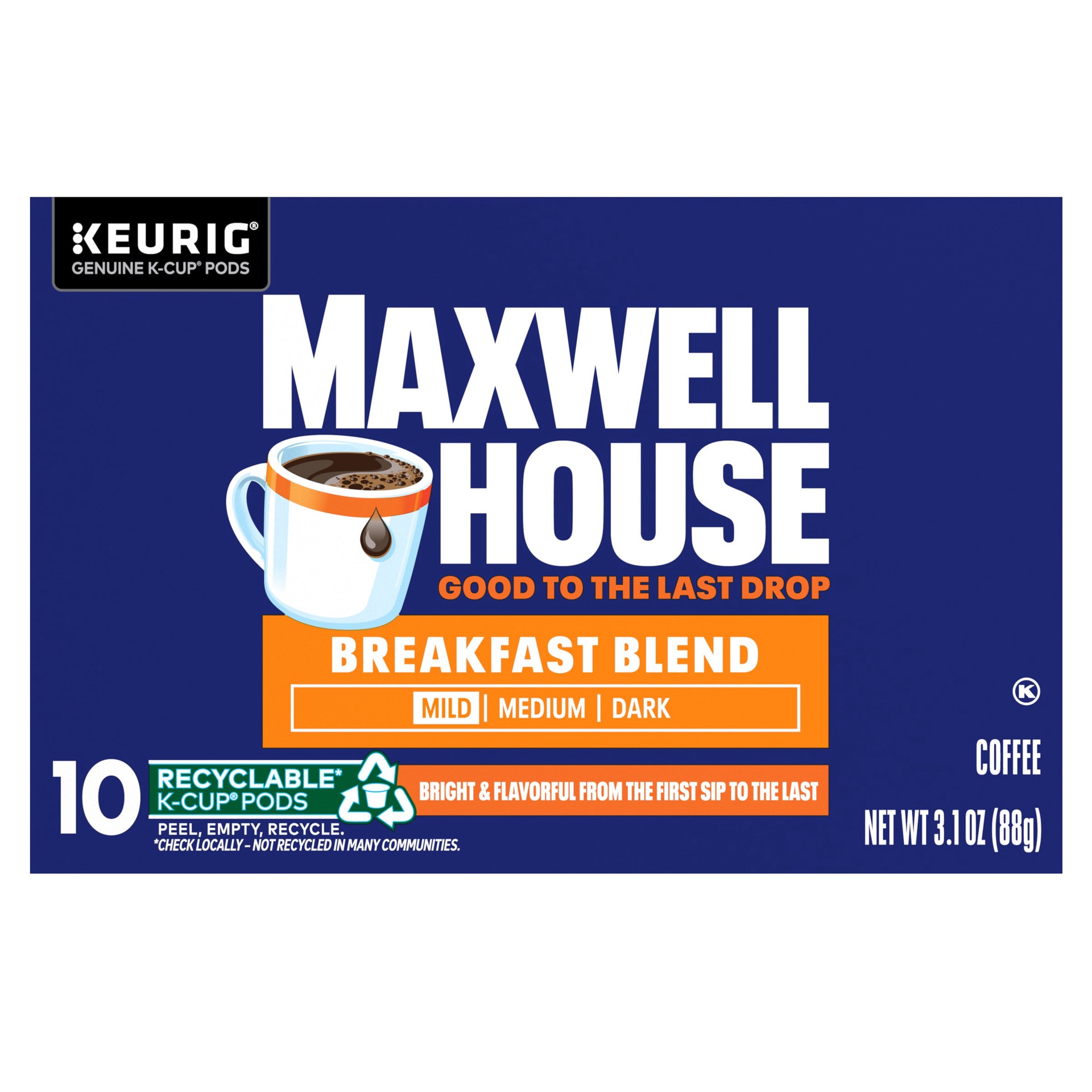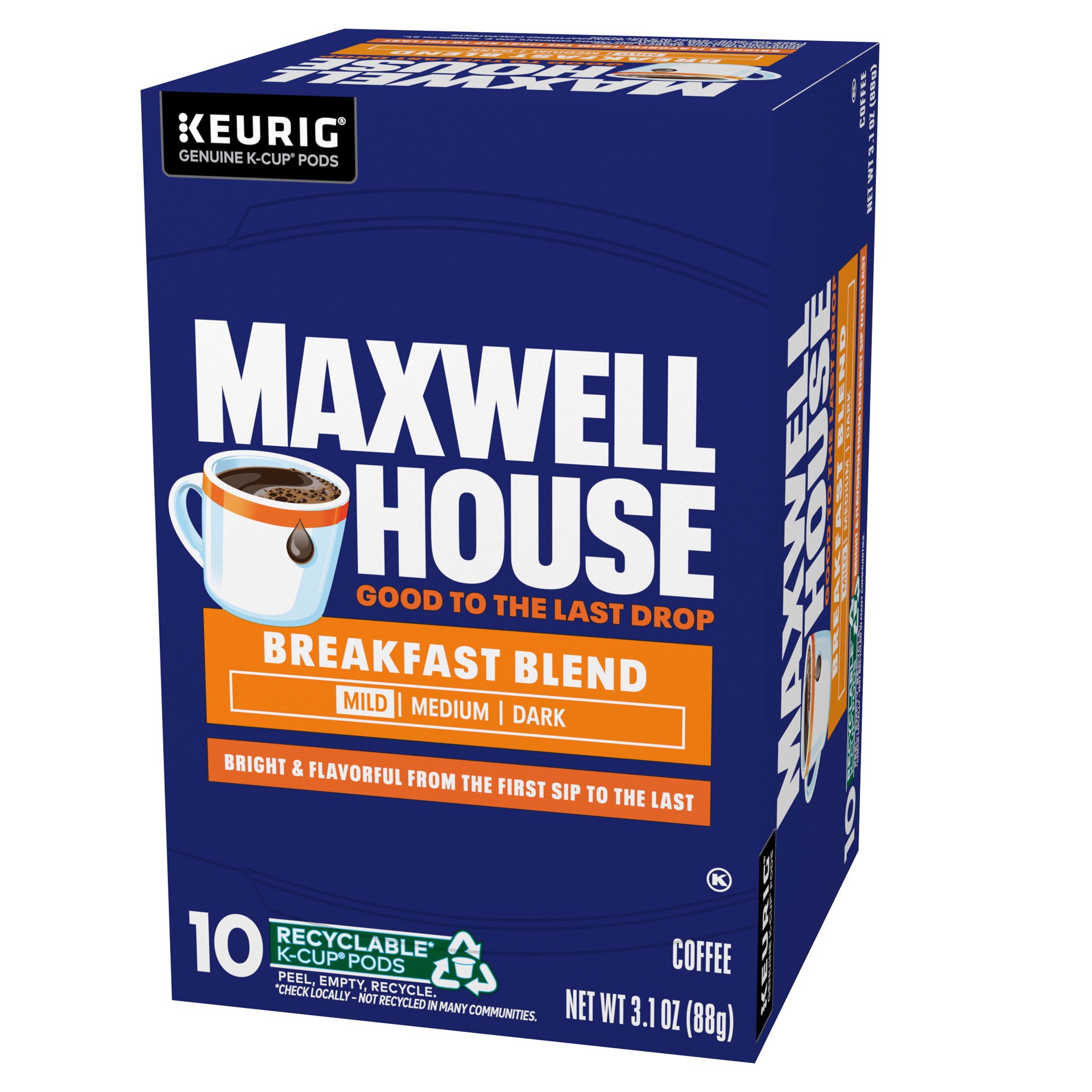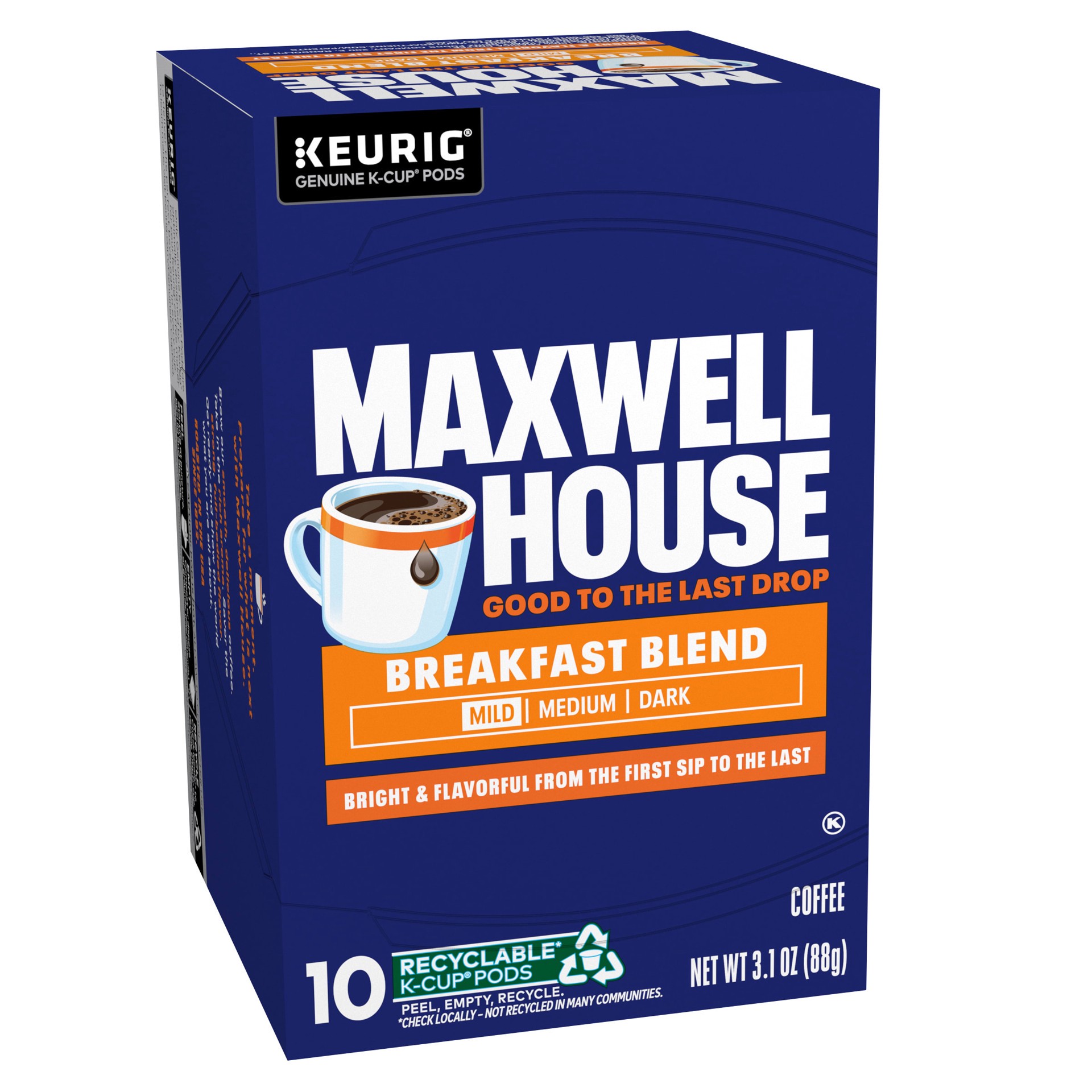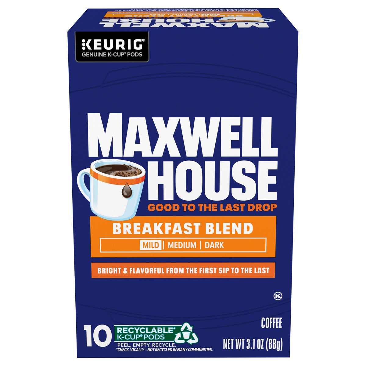 - MAXWELL HOUSE COFFEE: 10 ct box of Maxwell House Breakfast Blend Mild Roast K-Cup Coffee Pods