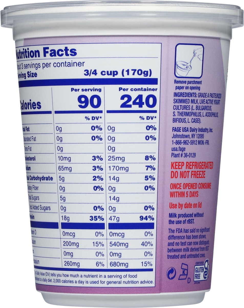 Per 6 Oz Serving: 18 g protein; 90 calories. Certified gluten free. gfco.org. Non-GMO Project verified. nongmoproject.org. Milk produced without the use of rBST. The FDA has said no significant differ…