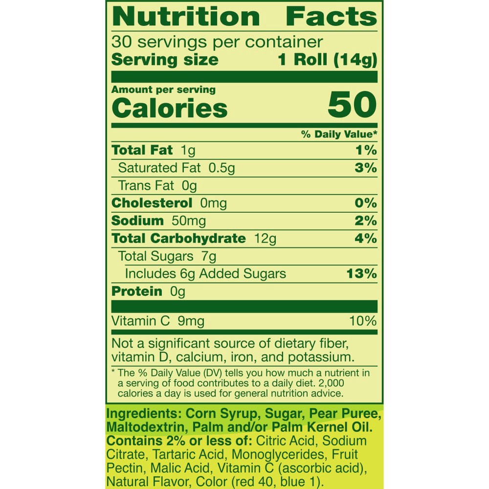 Strawberry Blast: Corn Syrup, Sugar, Pear Puree, Maltodextrin, Palm and/or Palm Kernel Oil, Contains 2% or Less of: Citric Acid, Sodium Citrate, Monoglycerides, Fruit Pectin, Malic Acid, Vitamin C (As…