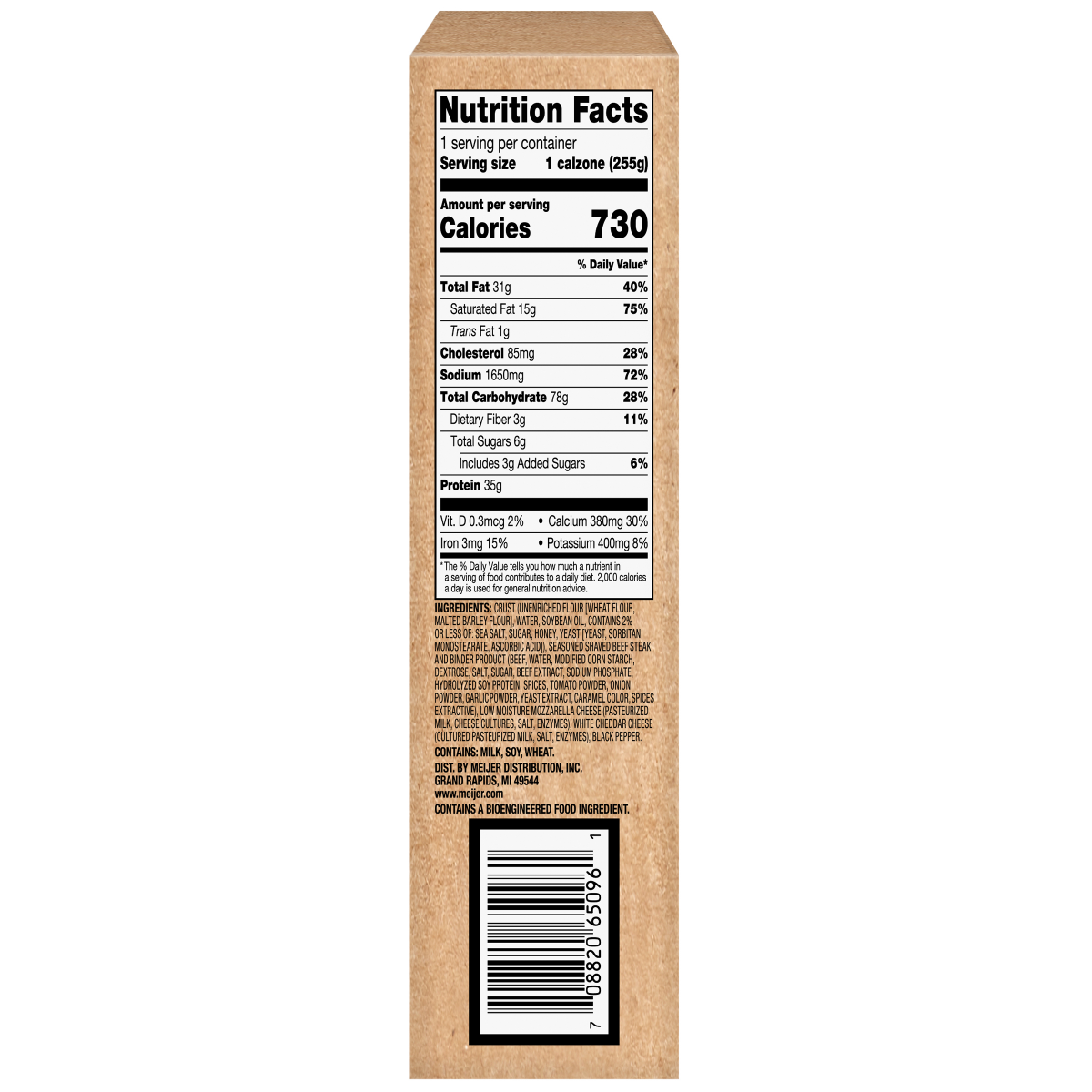Experience the hearty flavors of Crafted Market by Meijer Steak and Cheese Calzone, made with seasoned, shaved beef steak and cheese baked inside of a golden crust.