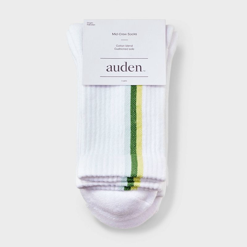 Experience all-day comfort with these Vertical Stripes Cushioned Mid Crew Socks from Auden™. This three-pack set of mid crew socks features one solid white pair and two white pairs with vibrant stripe…