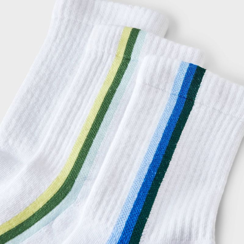 - Solid white pair and 2 white pairs with vibrant striped patterns in different colors