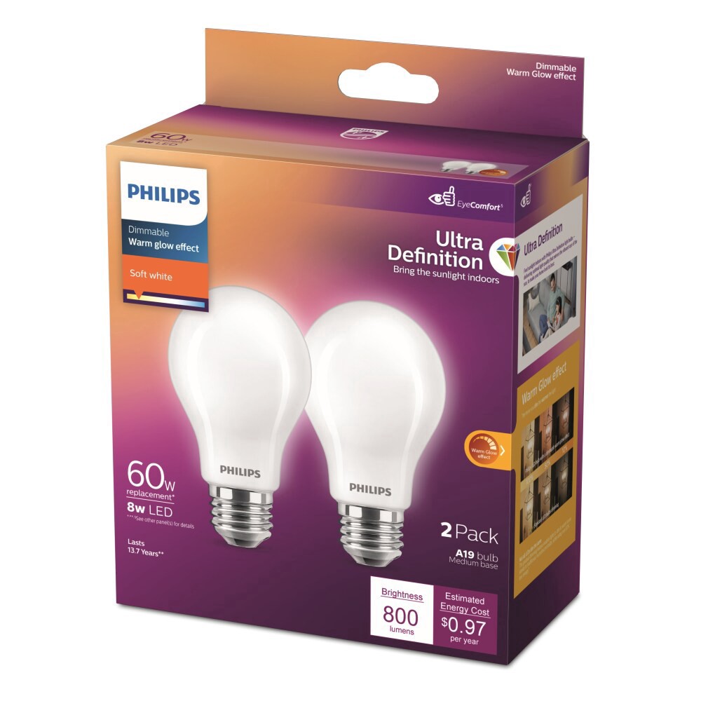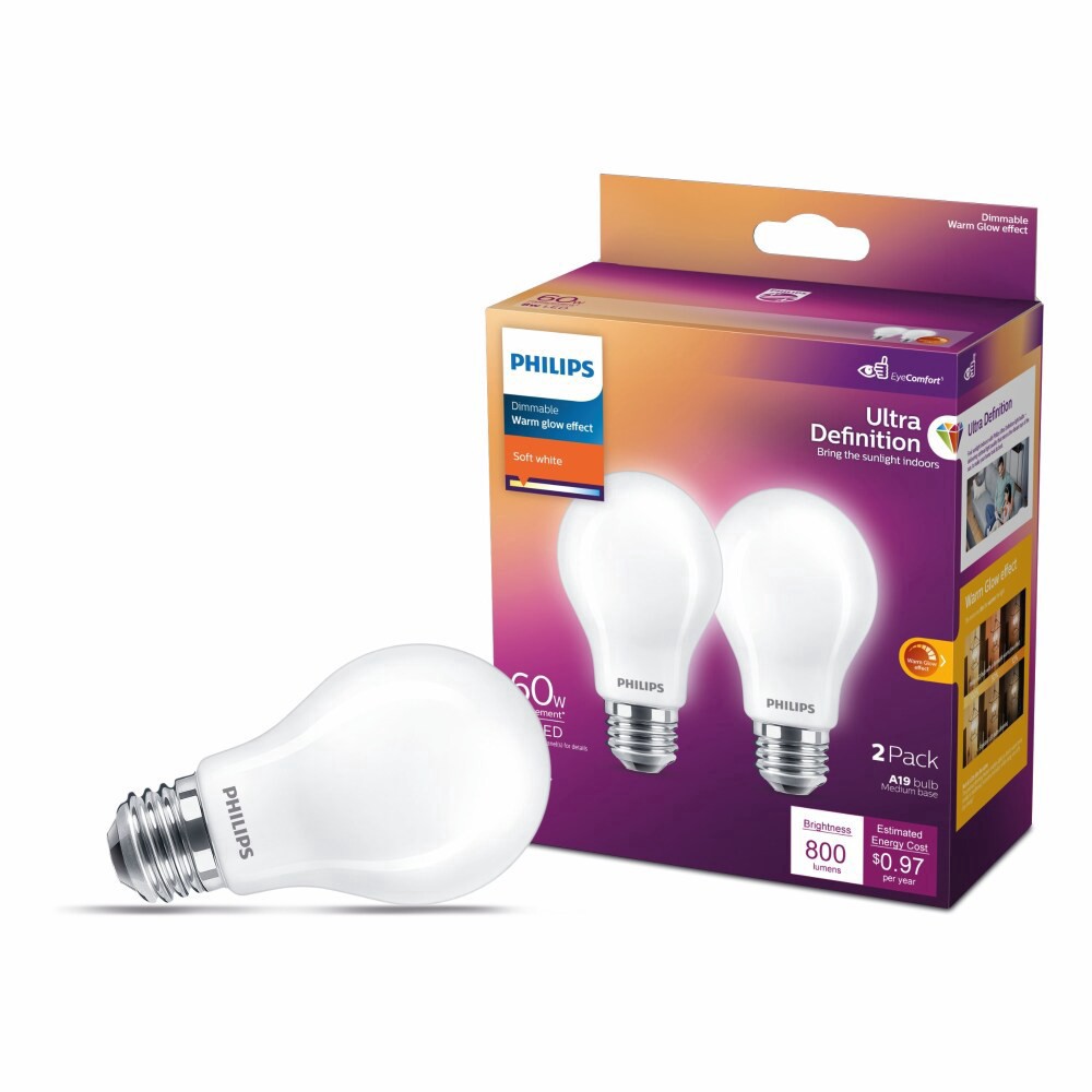 Philips Frosted A19 Dimmable Ultra Definition Light Bulb, EyeComfort Technology, Soft White, 8W=60W, Title 20 Certified, 2-Pack"See True Colors: Ultra Definition bulbs are equipped with a color render…