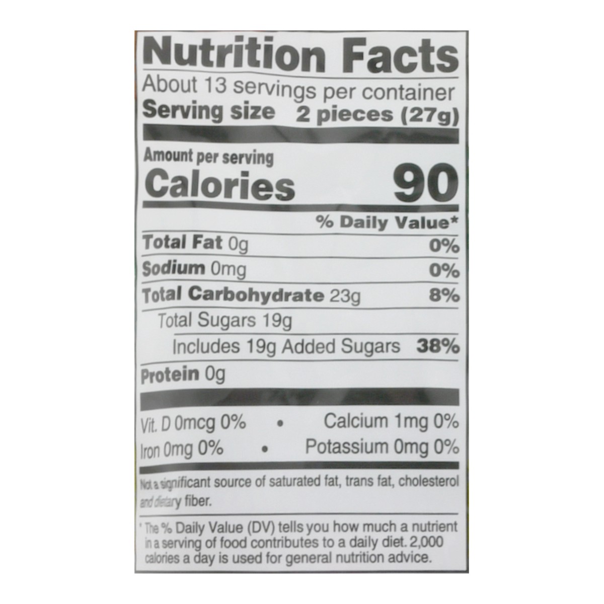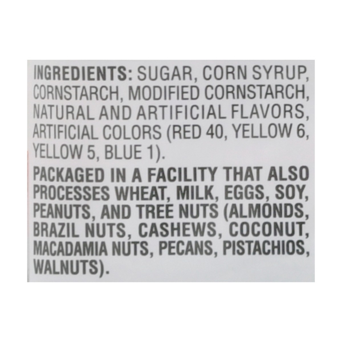 Sugar, Corn Syrup, Cornstarch, Modified Cornstarch, Natural and Artificial Flavors, Artificial Colors (Red 40, Yellow 6, Yellow 5, Blue 1).