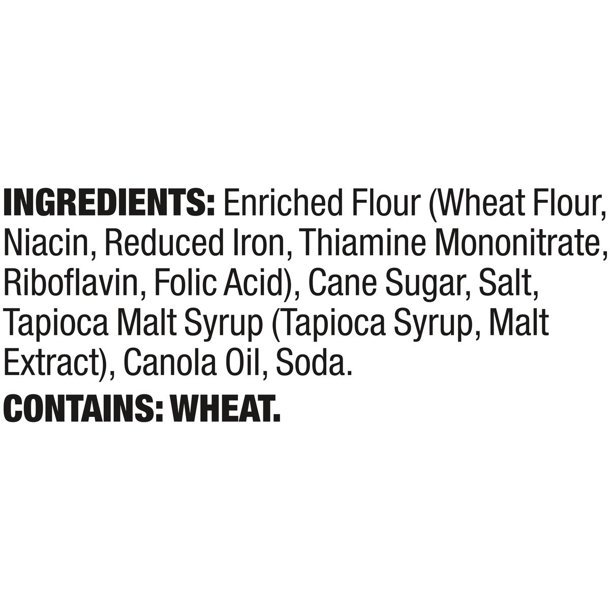 INGREDIENTS: ENRICHED FLOUR (WHEAT FLOUR, NIACIN, REDUCED IRON, THIAMINE MONONITRATE, RIBOFLAVIN, FOLIC ACID), CANE SUGAR, SALT, TAPIOCA MALT SYRUP (TAPIOCA SYRUP, MALT EXTRACT), CANOLA OIL, SODA. CON…