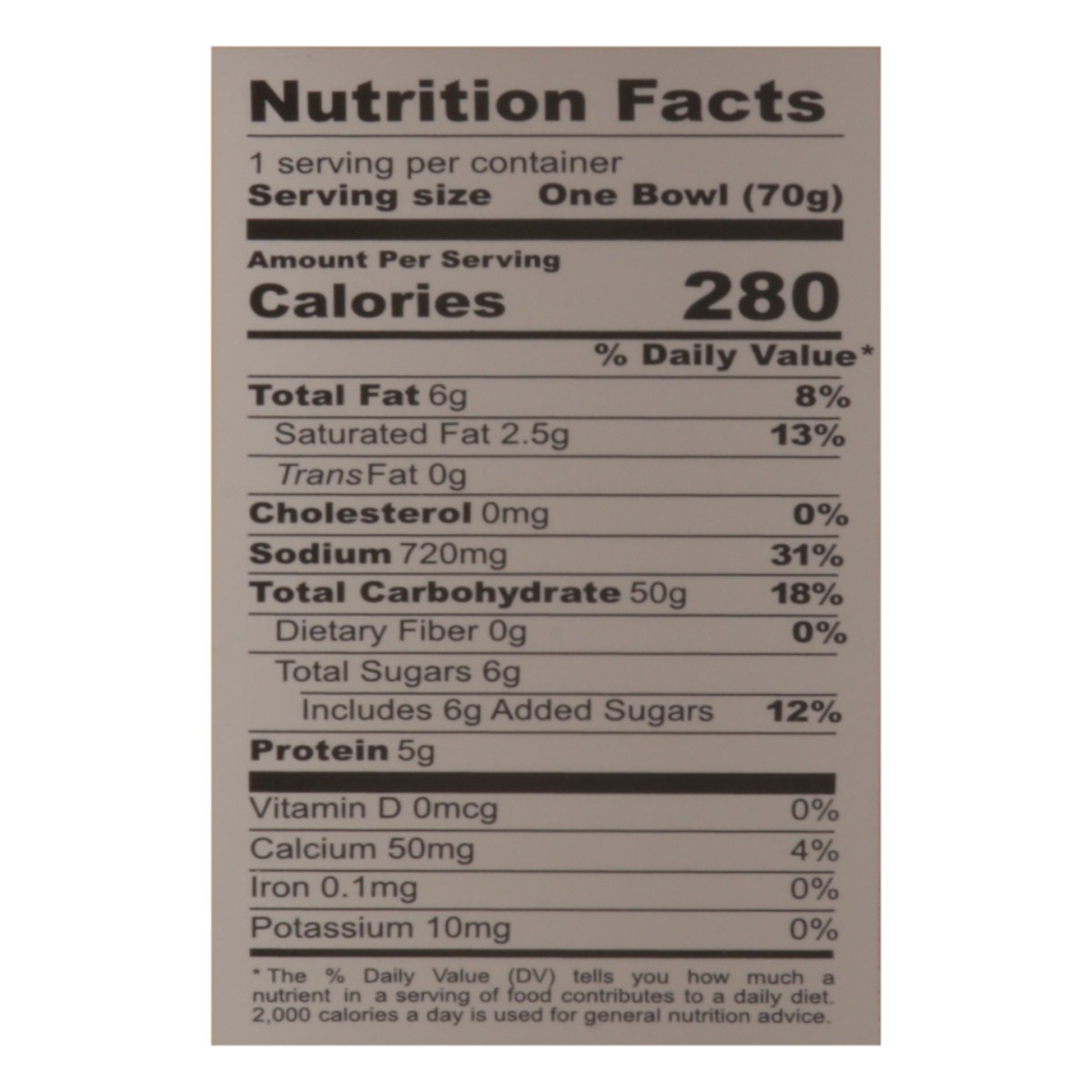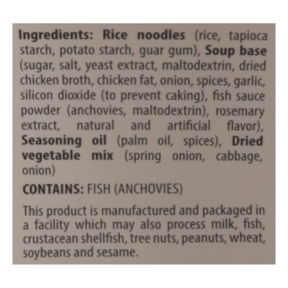 Rice Noodles (Rice, Tapioca Starch, Potato Starch, Guar Gum), Soup Base (Sugar, Salt, Yeast Extract, Maltodextrin, Dried Chicken Broth, Chicken Fat, Onion, Spices, Garlic, Silicon Dioxide (to Prevent …