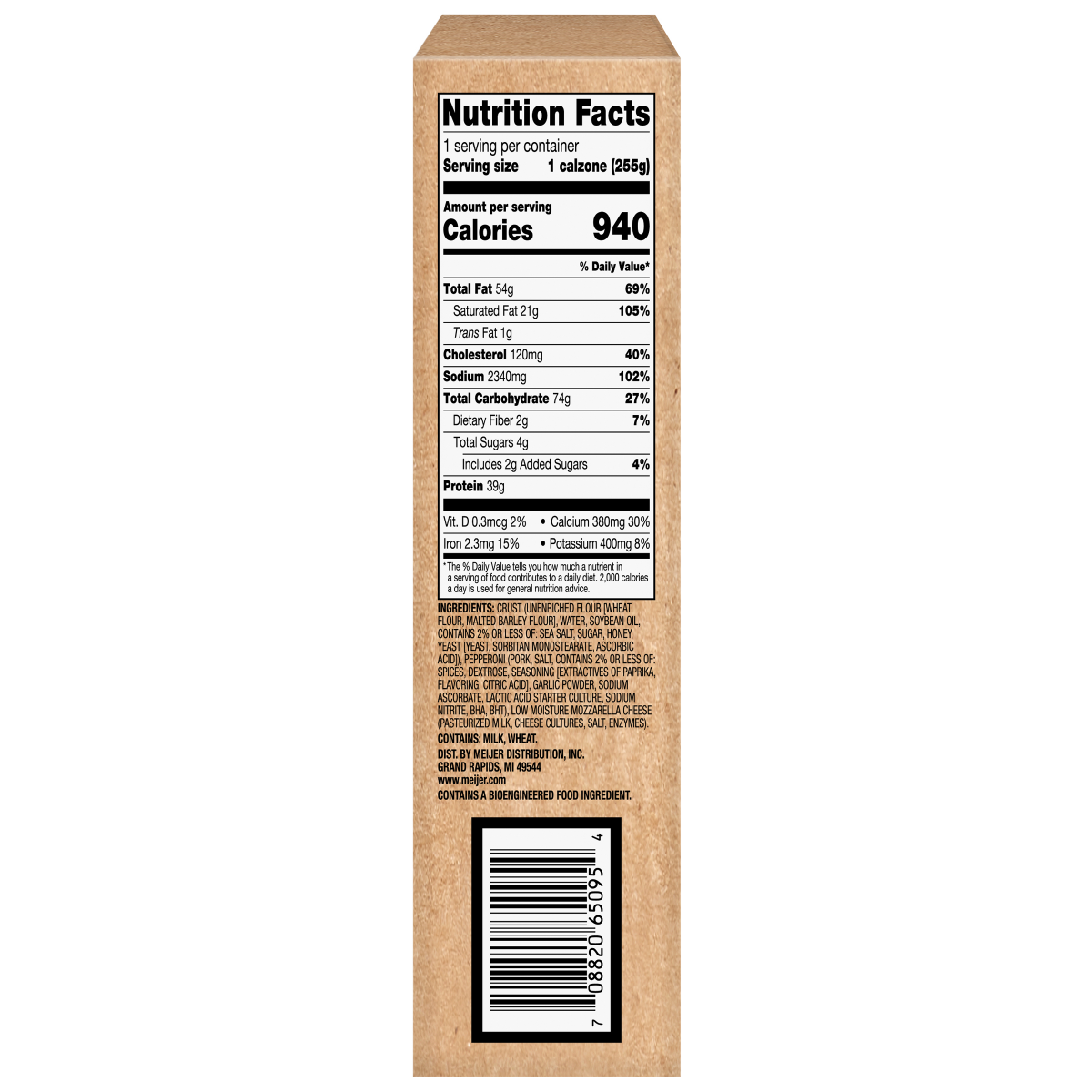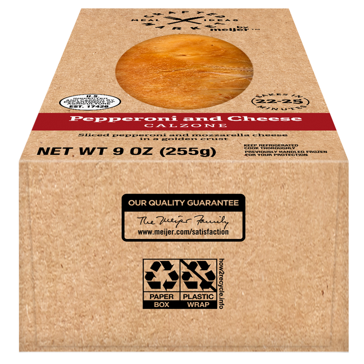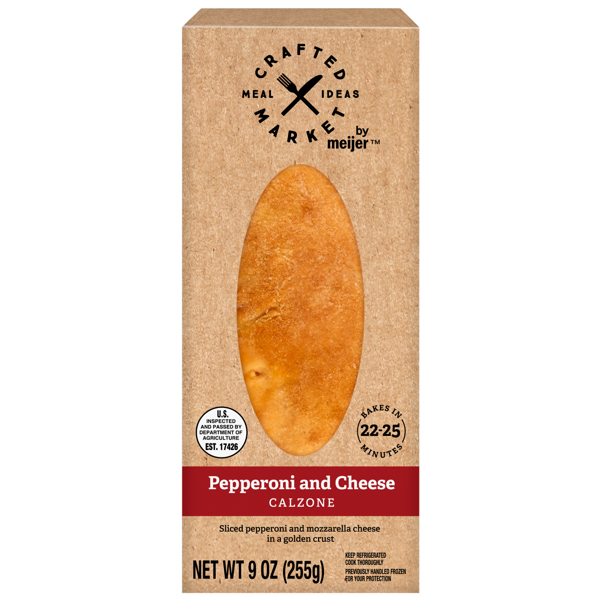 Enjoy a Crafted Market by Meijer Pepperoni and Cheese Calzone, a delicious meal option that's easy to prepare. Made with sliced pepperoni and mozzarella cheese, baked in a golden crust.