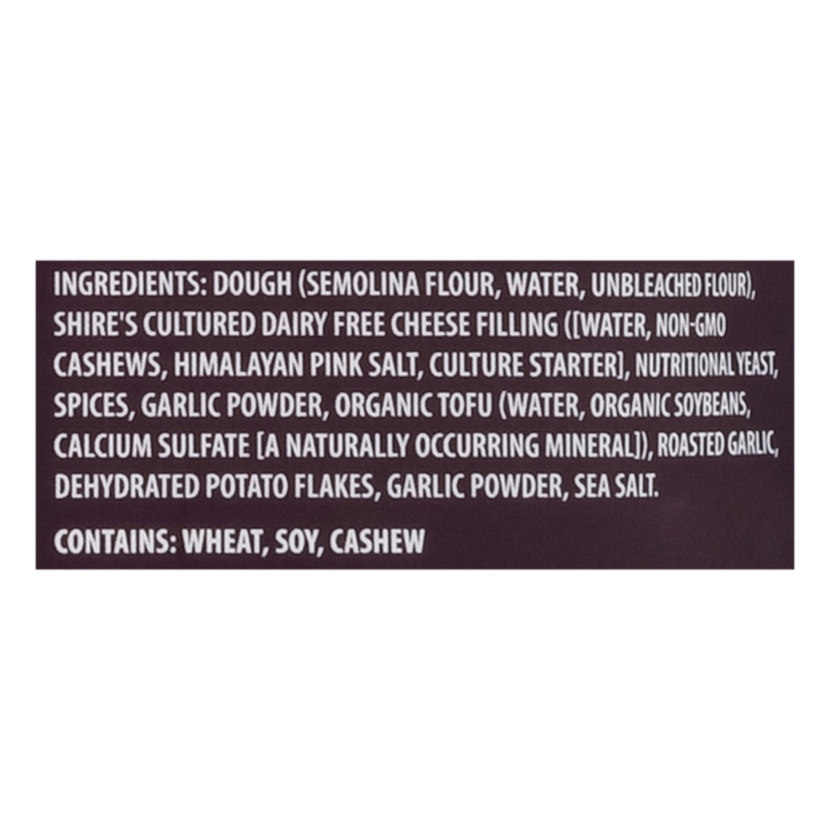 Dough (Semolina Flour, Water, Unbleached Flour), Shire’s Cultured Dairy Free Cheese Filling ([Water, Non-GMO Cashews, Himalayan Pink Salt, Culture Starter], Nutritional Yeast, Spices, Garlic Powder, O…