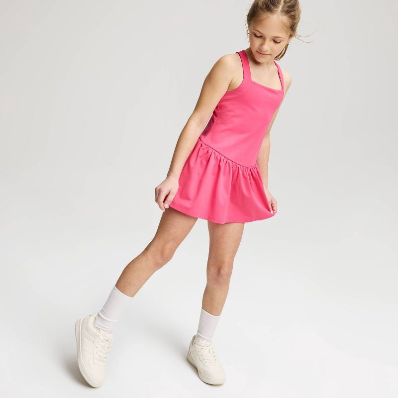 Add playful style to your child's wardrobe with this Knit Dress from Cat & Jack™. Made from midweight recycled polyester-spandex blend jersey fabric, this sleeveless dress features a square neckline w…