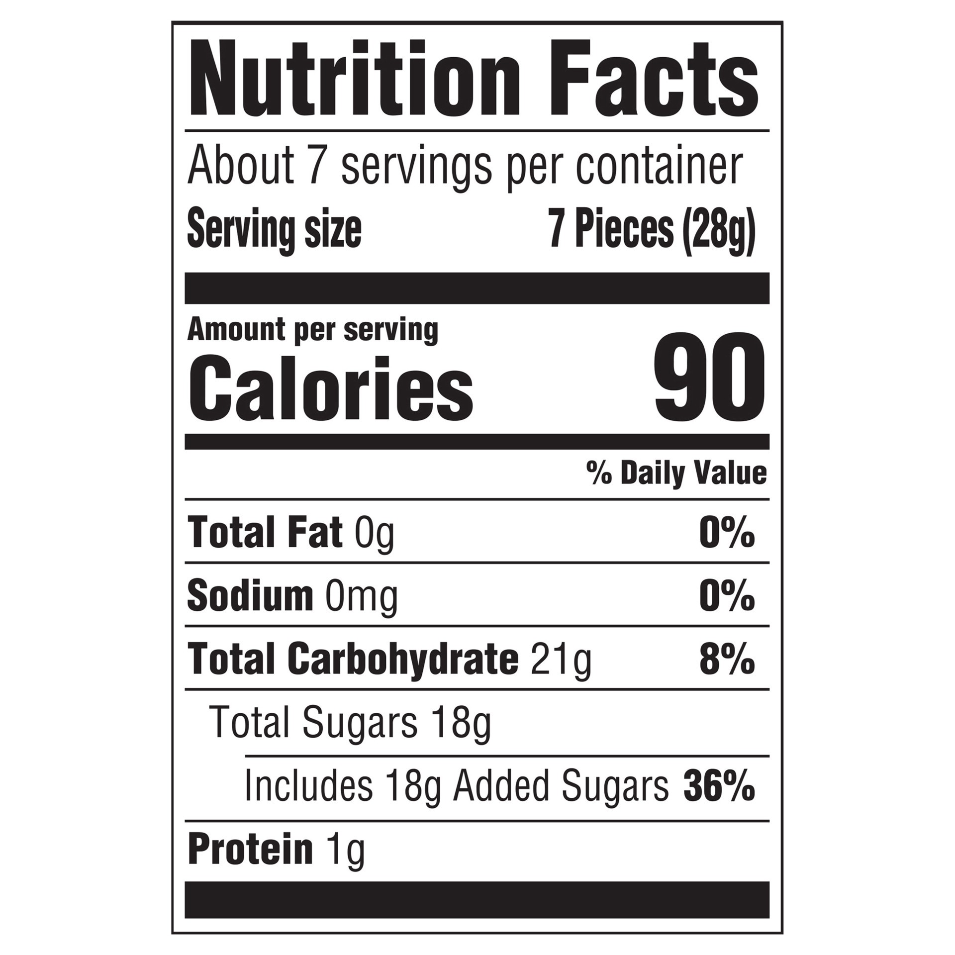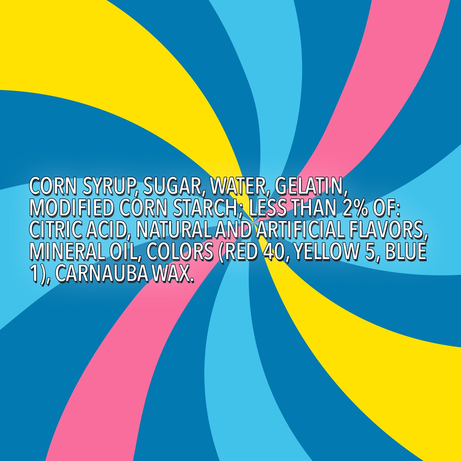 Made of: Corn Syrup, Sugar, Water, Modified Corn Starch, Gelatin; Less than 2% of: Citric Acid, Natural and Artificial Flavors, Mineral Oil, Colors (Red 40, Yellow 5, Blue 1), Carnauba Wax.