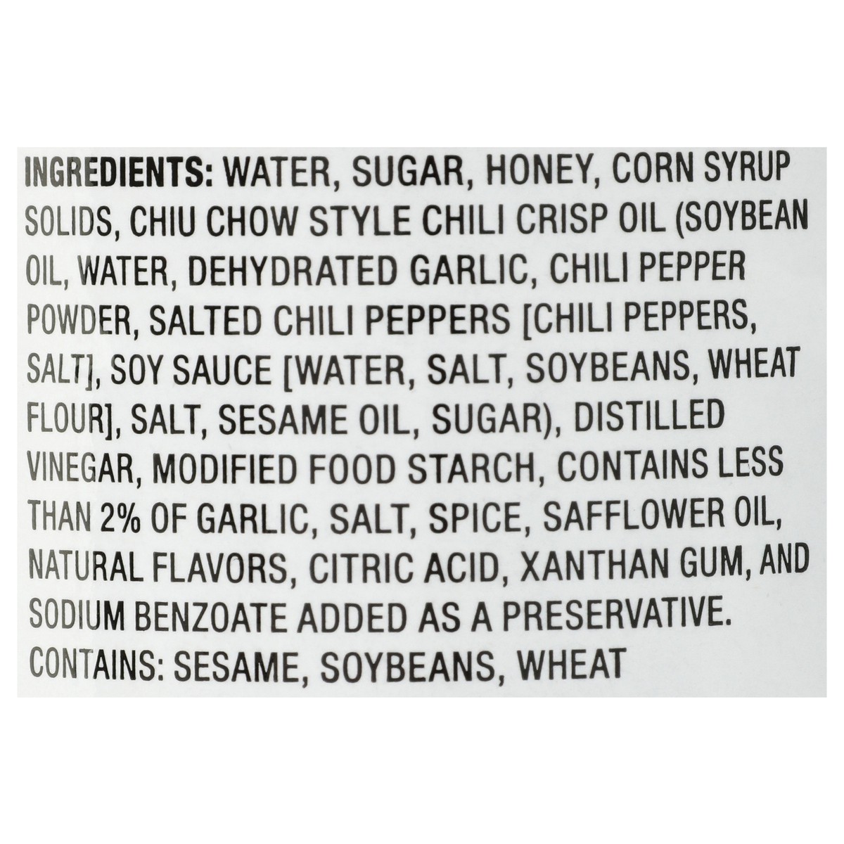 Water, Sugar, Honey, Corn Syrup Solids, Chiu Chow Style Chili Crisp Oil (Soybean Oil, Water, Dehydrated Garlic, Chili Pepper Powder, Salted Chili Peppers [Chili Peppers, Salt], Soy Sauce [Water, Salt,…