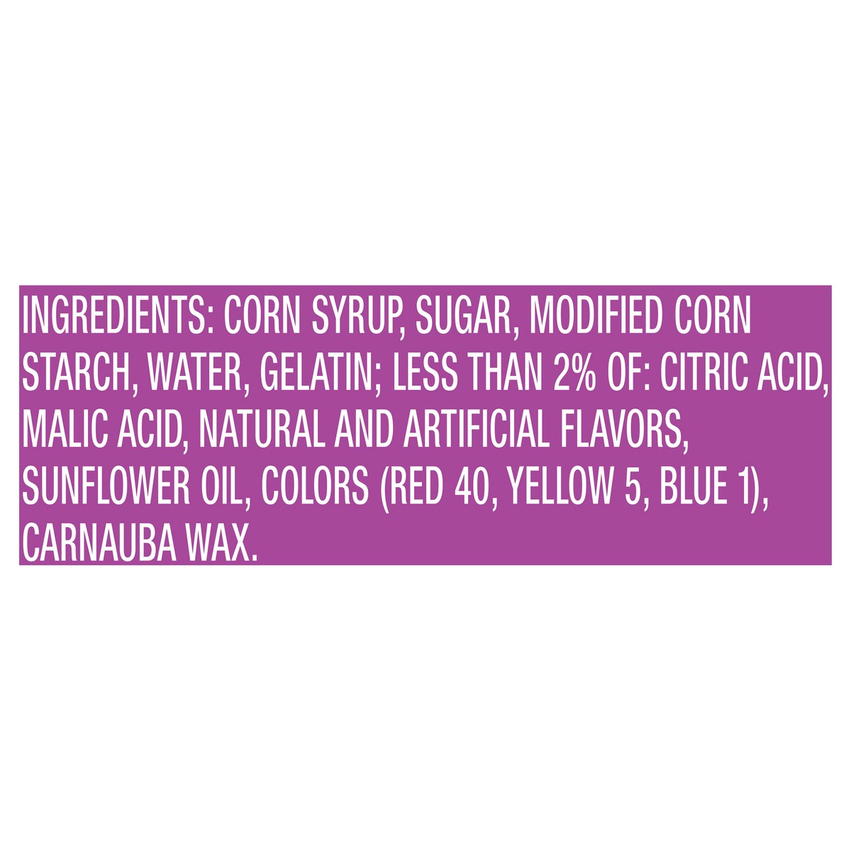 CORN SYRUP, SUGAR, MODIFIEDCORNSTARCH, WATER, GELATIN; LESS THAN 2% OF:CITRIC ACID, MALIC ACID, NATURAL AND ARTIFICIALFLAVORS, SUNFLOWER OIL, COLORS (RED 40, YELLOW 5,BLUE 1), CARNAUBA WAX.