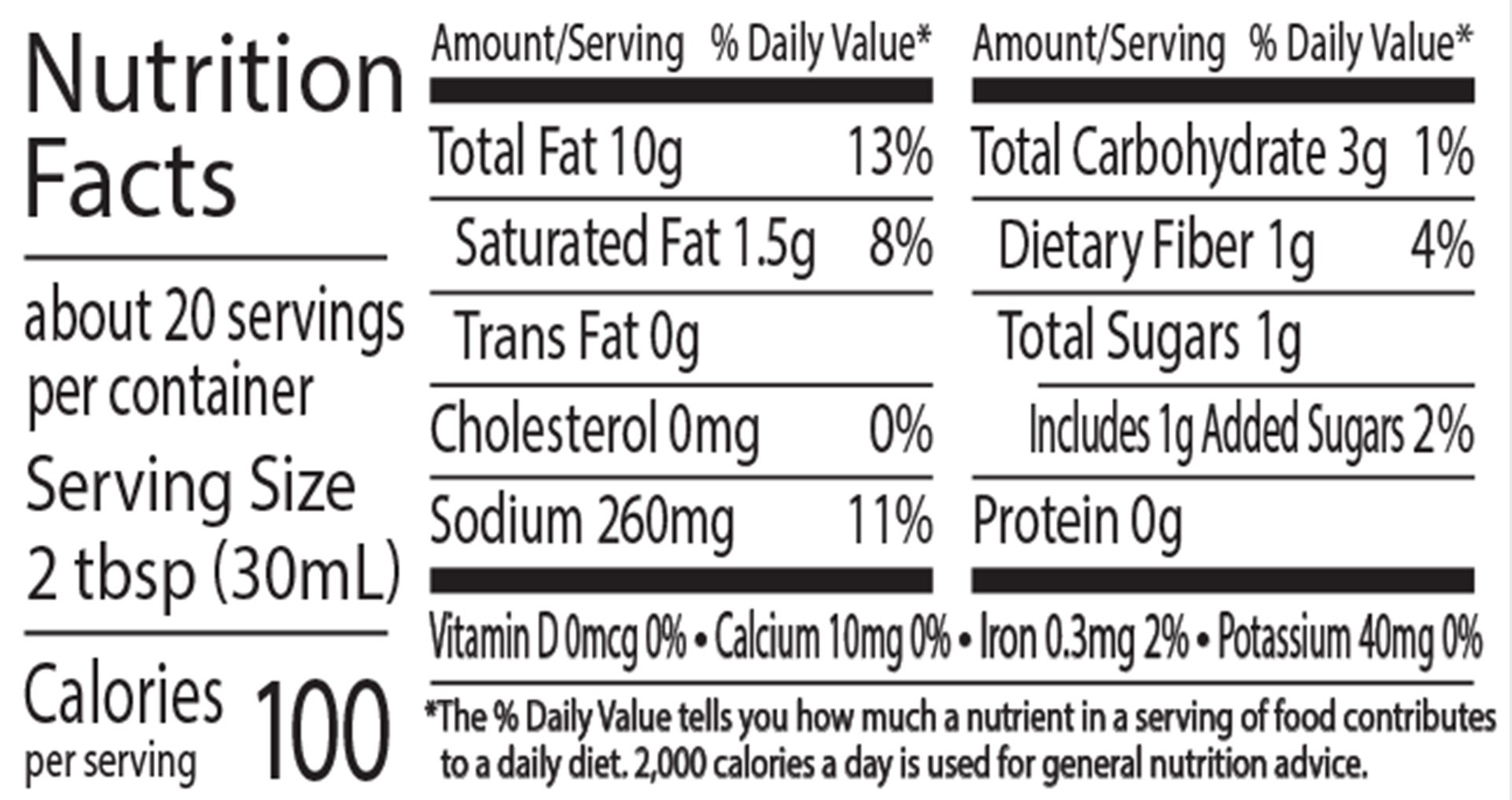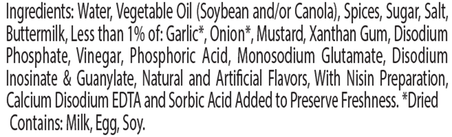 Water, Vegetable Oil (Soybean and/or Canola), Spices, Sugar, Salt, Buttermilk, Less than 1% of: Garlic*, Onion*, Mustard, Xanthan Gum, Disodium Phosphate, Vinegar, Phosphoric Acid, Monosodium Glutamat…