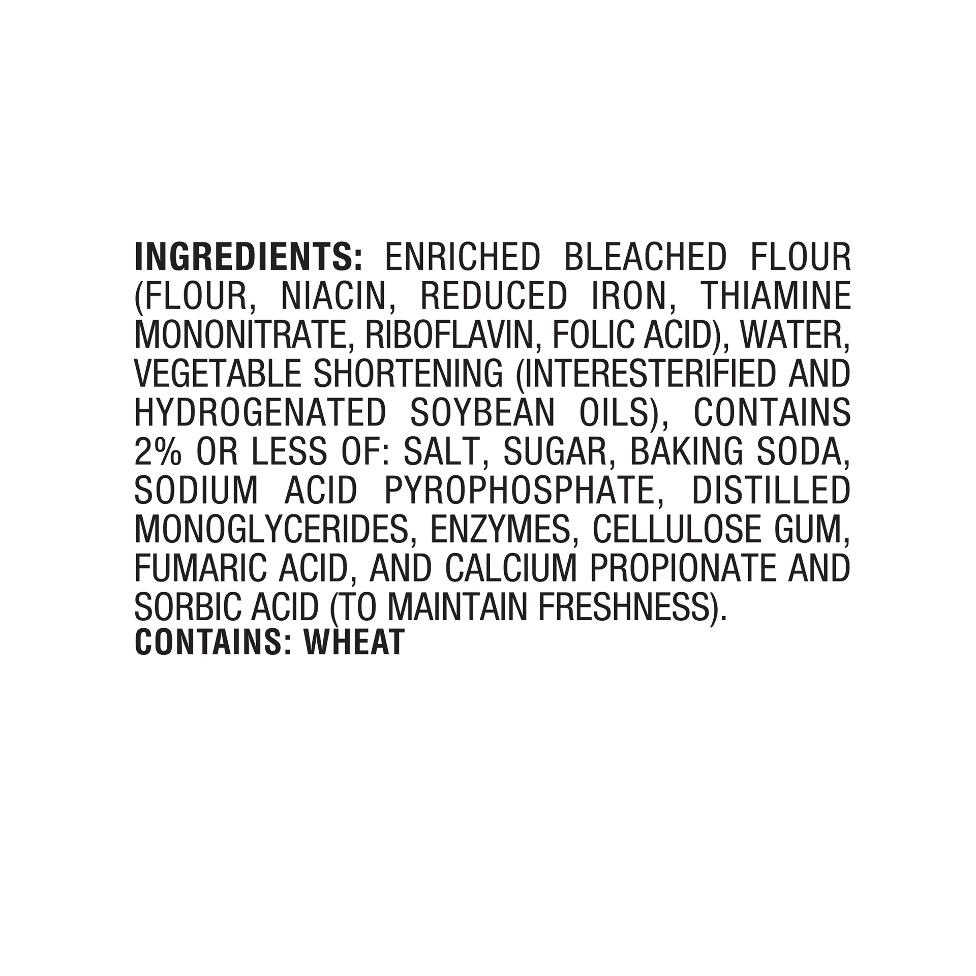 Enriched Bleached Flour (Flour, Niacin, Reduced Iron, Thiamine Mononitrate, Riboflavin, Folic Acid), Water, Vegetable Shortening (Interesterified and Hydrogenated Soybean Oils), Contains 2% or Less of…